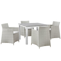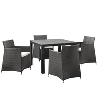 Converge for great moments spent outdoors with the Junction Outdoor Patio Dining Furniture Set. Junction Patio Furniture is a proudly designed set with an audacious style that encourages lively repartee. Covered in a synthetic rattan weave, all-weather machine washable seat cushion, and powder-coated aluminum frame with plastic foot glides, Junction Outdoor Patio set does not require assembly and comes ready for contemporary patios, backyards, poolside, and other outdoor lounge areas.