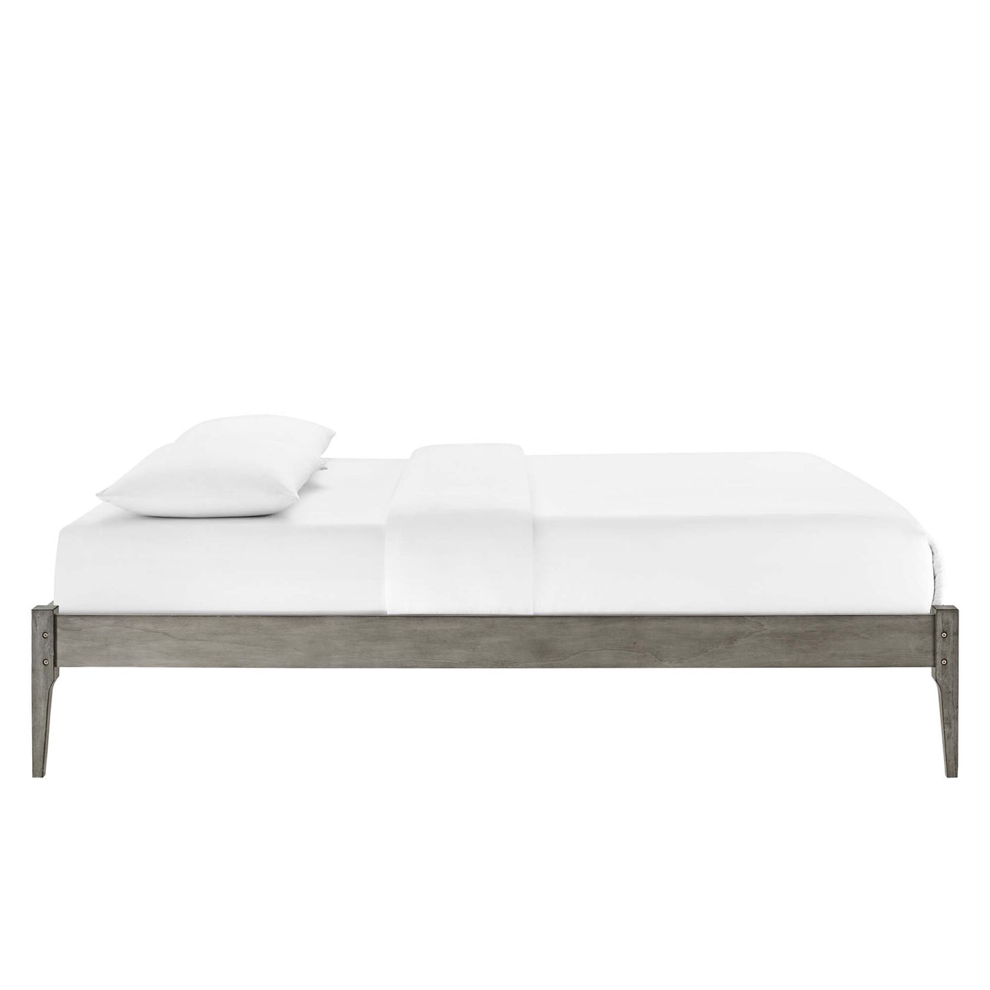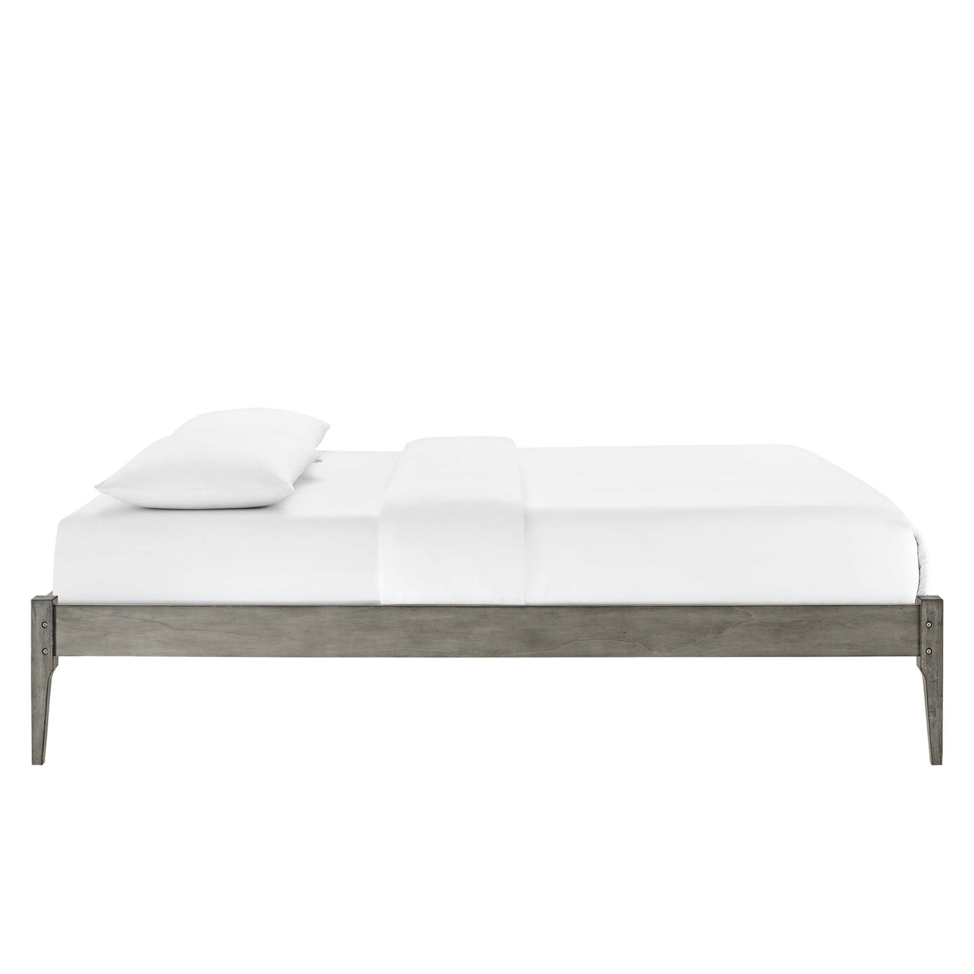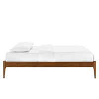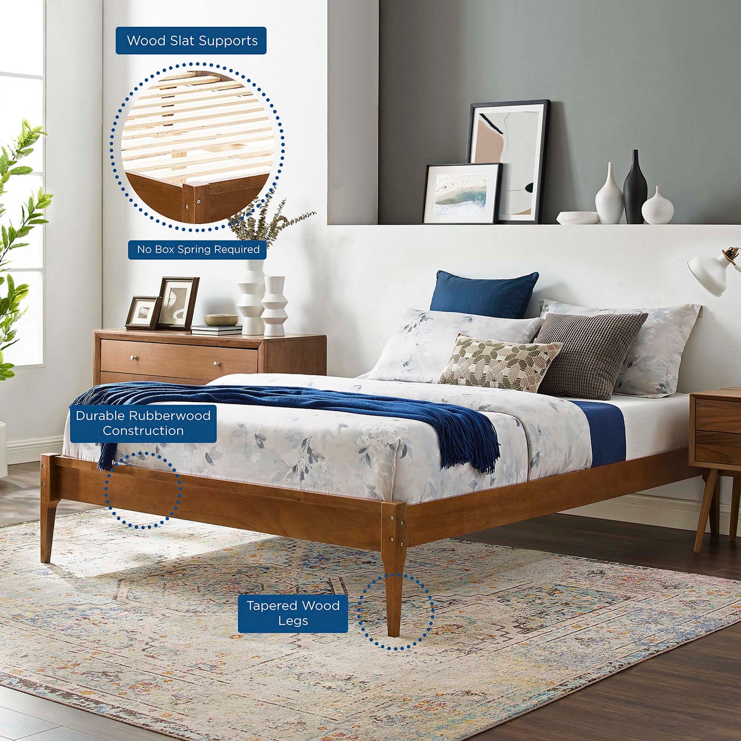 Refresh your bedroom with modern style and updated comfort with the June Full Platform Bed. Inspired by mid-century design, this full size bed frame boasts retro detail with contemporary accents and organic aesthetics to bring trending modernity to your guest bedroom or teenager's bedroom. This platform bed frame is a sturdy addition to the bedroom with a durable wood, MDF, and veneer construction and four tapered rubberwood legs. Eliminating the need for a box spring, this full bed is complete with a wood slat support system, reinforced center beam, and supporting legs that make it a lasting mattress foundation for memory foam, latex, innerspring, and hybrid mattresses. Assembly required. Full Bed Frame Weight Capacity: 601 lbs.