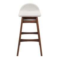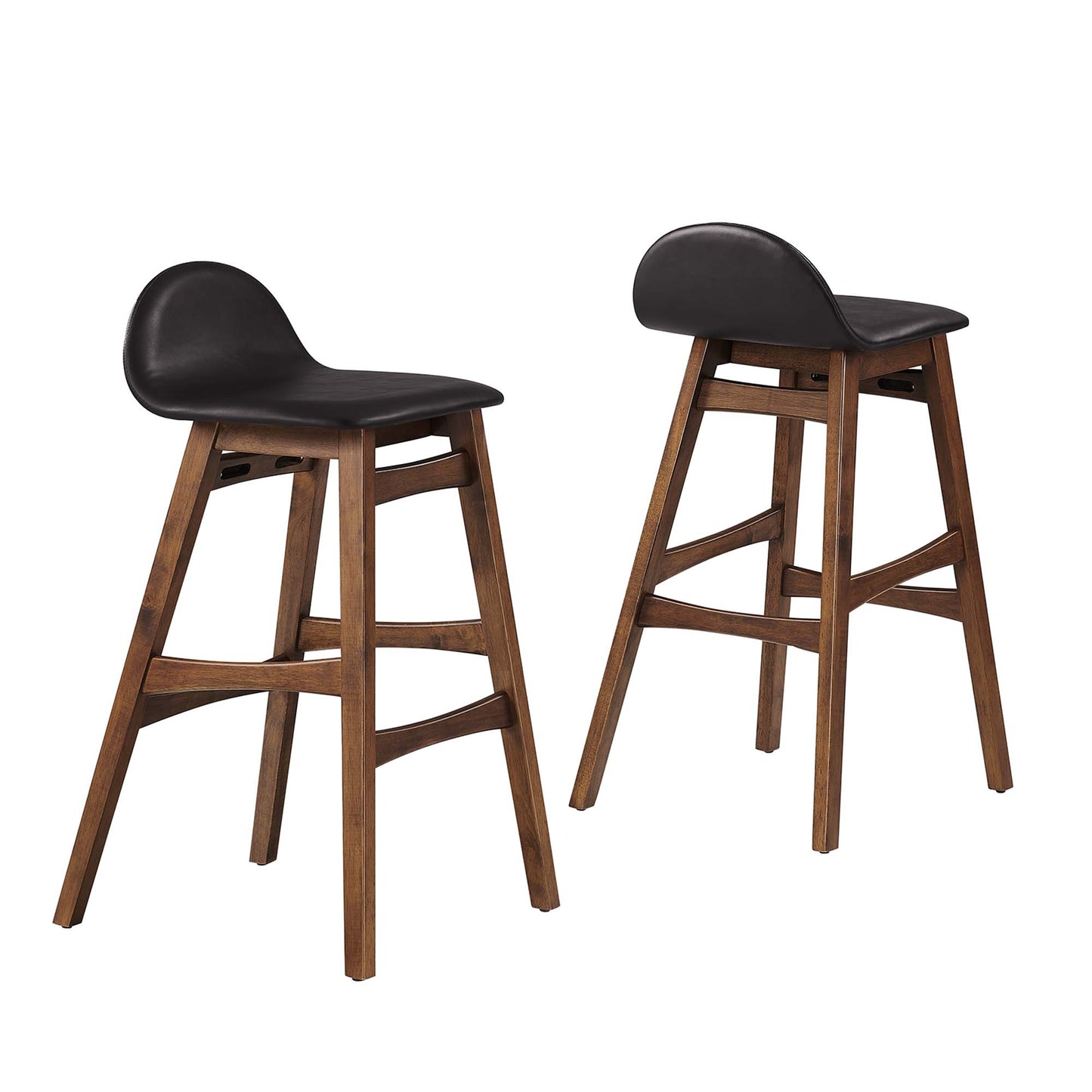 Invite lighthearted banter and deep conversations as you perch on the Juno Bar Stool Set of Two. This set of bar stools boasts splayed rubberwood legs and durable plywood seats, upholstered in woven heathered fabric. The unique arched contour of the low backrest, paired with integrated footrests and side supports, ensures optimal comfort for lasting sit-downs. With a mix of vintage-modern style and mid-century appeal, this pair of stools is multifaceted, serving as pub chairs, dive bar seating, or unique dining accents. Ideal for kitchens, bar areas, dining counters, and entertainment spaces, the Juno Bar Stool Set effortlessly complements any decor. Assembly required. Weight Capacity: 220 lbs.