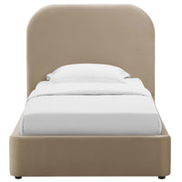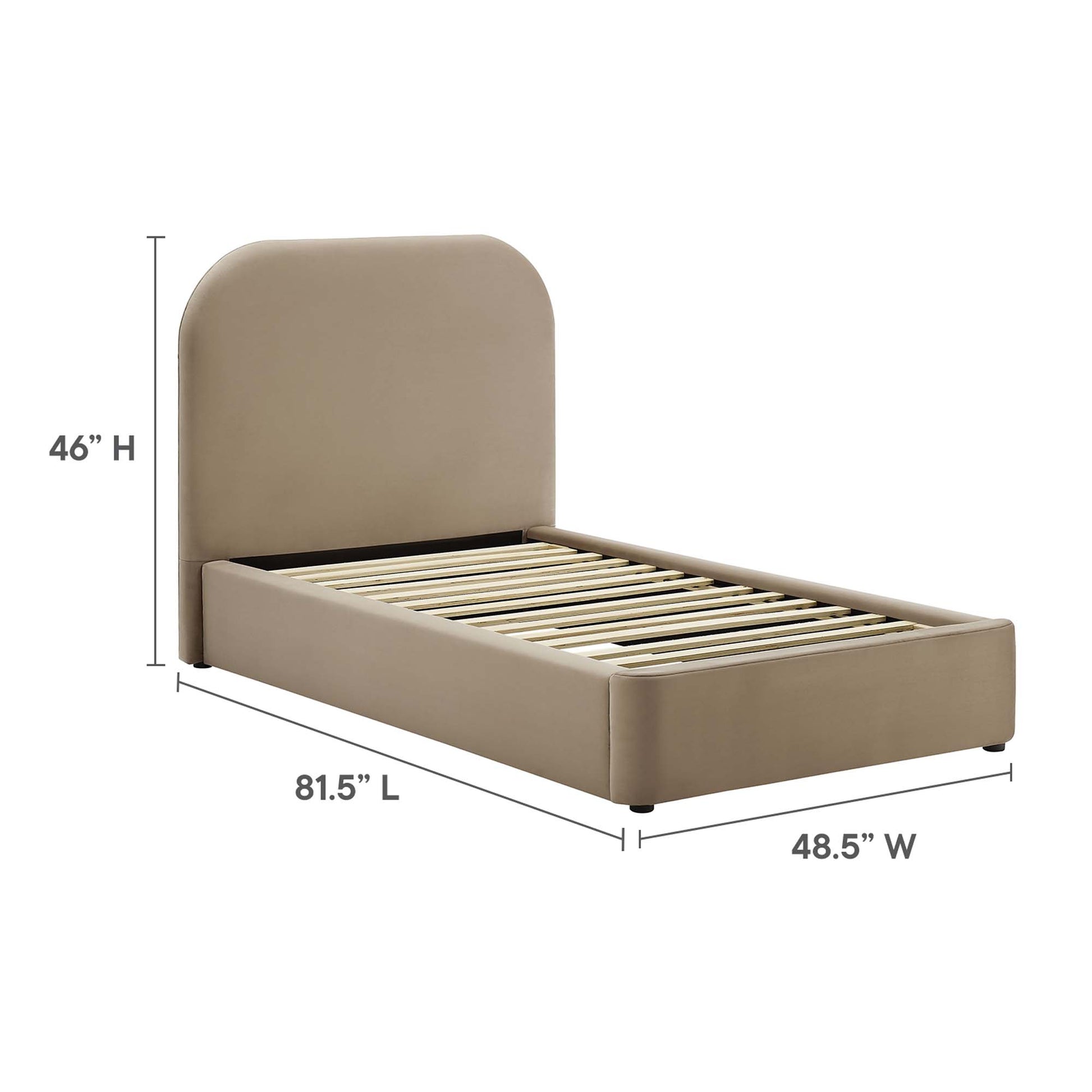 Delight in the upscale serenity of the Keynote twin size bed frame. Cloaked in stain-resistant performance velvet and filled with dense foam, this bed frame twin size adapts to various decorative themes, making it excellent as a spare bed or as a kids twin bed. Boasting a gently curve shaped headboard, it features a cloud bed frame that subtly extends beyond the mattress's edge. The robust MDF construction and wooden slat base of the Keynote upholstered platform bed frame makes the use of a traditional box spring redundant, making it compatible with all types of mattresses, such as memory foam, innerspring, latex, and hybrid. Each single bed frame stands on practical and durable LVL legs, and comes equipped with non-marking caps to protect floors. The soft bed frame of the Keynote modern twin platform bed, complete with an elegantly upholstered headboard, offers a modern and contemporary upgrade to any bedroom setting. Mattress not included. Assembly required. Bed Frame Twin Size Weight Capacity: 800 lbs.