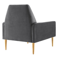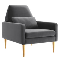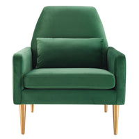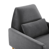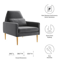 Introduce a minimalist aesthetic into your mid-century modern, eclectic, or contemporary living room, bedroom, or dining room with the sleek, well-crafted silhouette of the Liliana Performance Velvet Armchair. The gently angled backrest and the square body of this retro-modern armchair add architectural interest and create a low profile suitable for apartments or small spaces. Liliana stands on gold stainless steel legs fitted with non-marking foot glides. This stain-resistant performance velvet armchair features a removable seat cushion and pillow. Chair Weight Capacity: 331 lbs.
