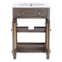 Encompassing the coastal aesthetics of tropical design, the Lilo 24" Bathroom Vanity effortlessly updates a bathroom space. Durably constructed with solid mindi wood, this vanity features a faux top drawer and two soft-close hinged doors adorned with natural rattan cane detail. Behind the two closed doors is an adjustable shelf and ample storage space to keep visual space clean and your bathroom essentials organized. This wood vanity features a ceramic sink basin with 8-inch centerset holes and an integrated countertop aligning style and function. Includes non-marking foot caps. Assembly required. Fixtures not included.