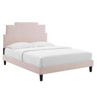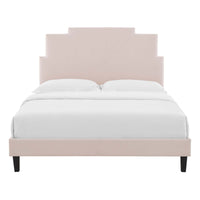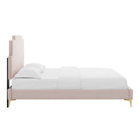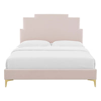 Elevate the style in a guest bedroom or teenager's bedroom with the Lindsey Performance Velvet Full Platform Bed. The padded headboard of this full size bed features luxe texture, clean lines, and escalating silhouette. Rich in glam deco style and vintage modern elegance, this upholstered bed is covered in stain-resistant performance velvet and is a sturdy mattress foundation for memory foam, innerspring, latex, and hybrid mattresses. Eliminating the need for a box spring, the MDF frame of this full platform bed is complete with a wood slat support system crafted with poplar for lasting durability and support. This slatted bed frame rests on gold metal legs with non-marking foot caps and includes a reinforced center beam with two support legs for enhanced stability. Assembly required. Full Bed Weight Capacity: 800 lbs.