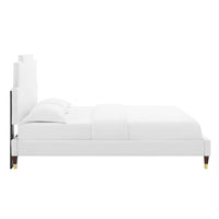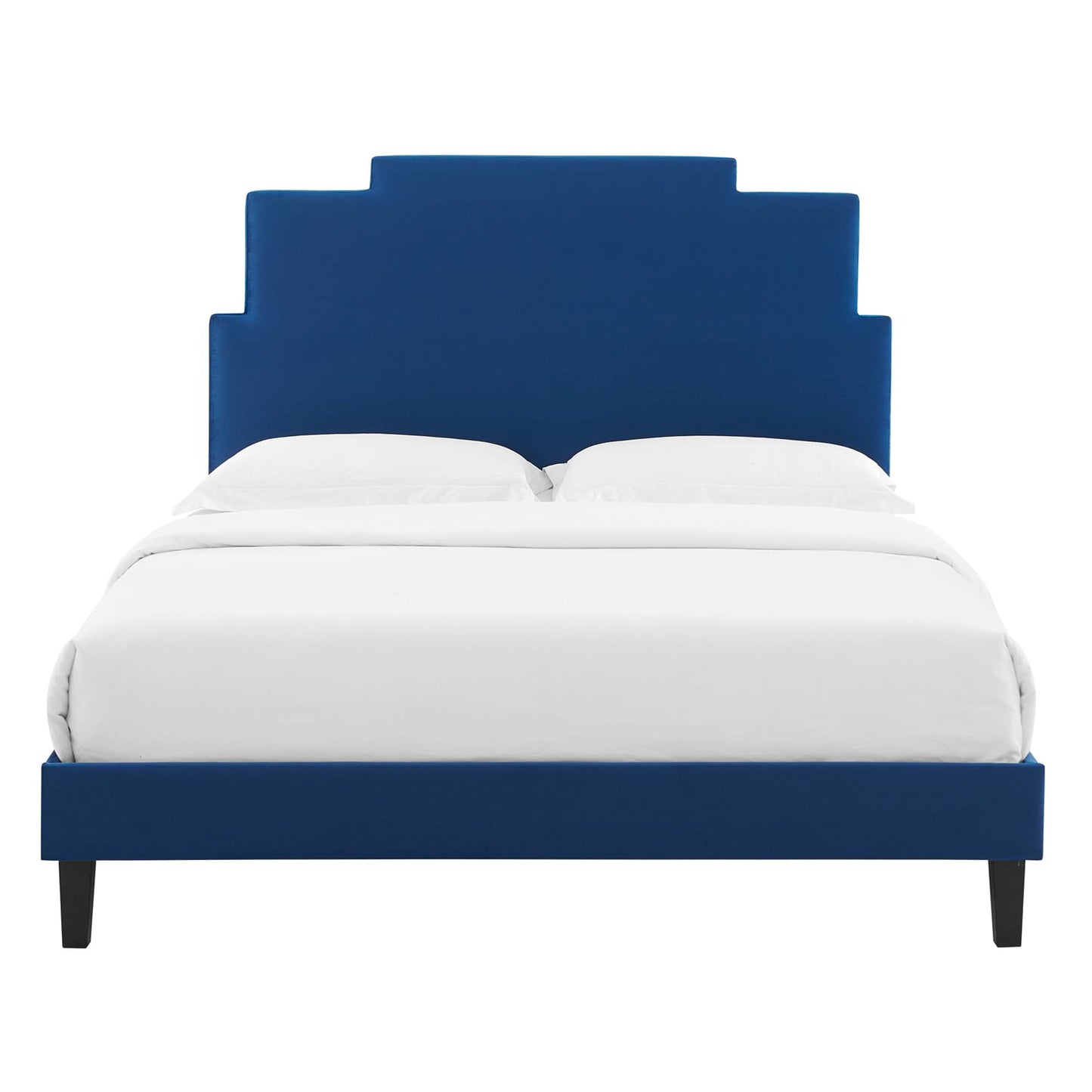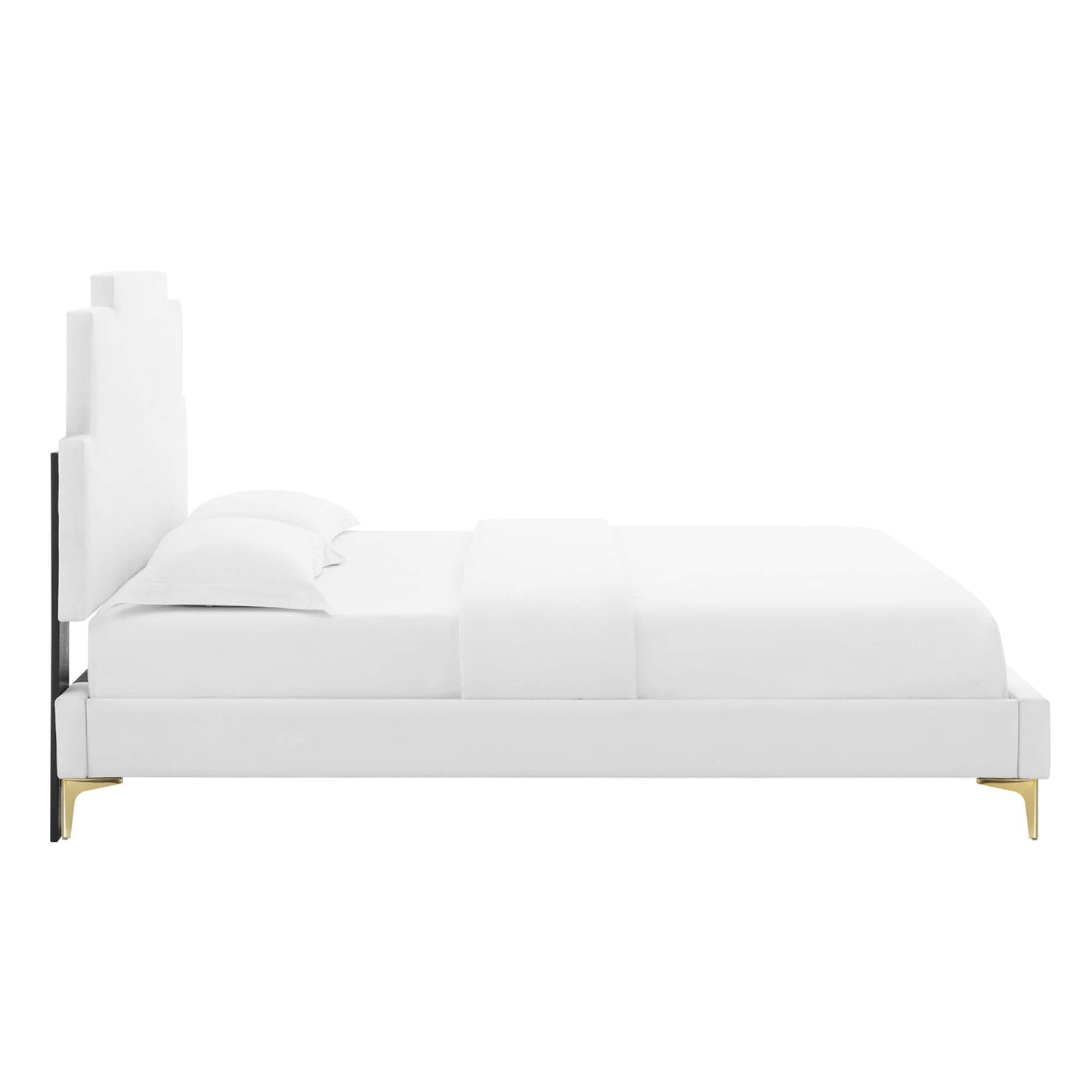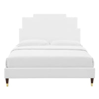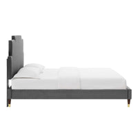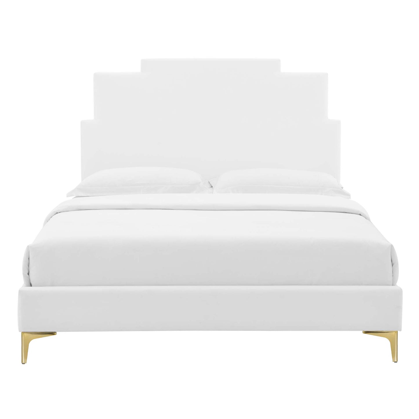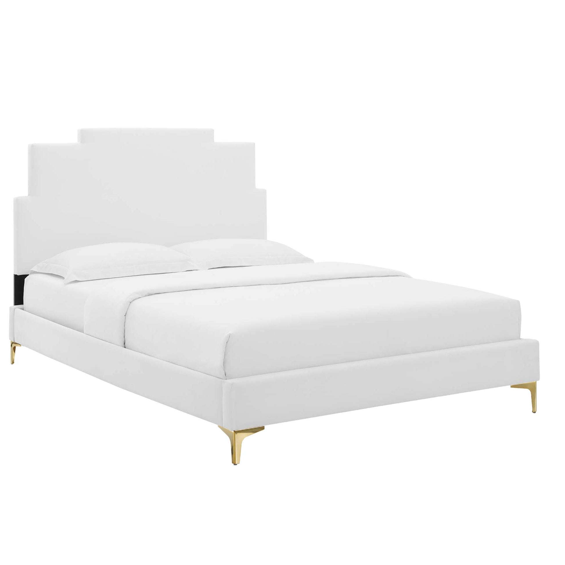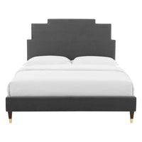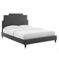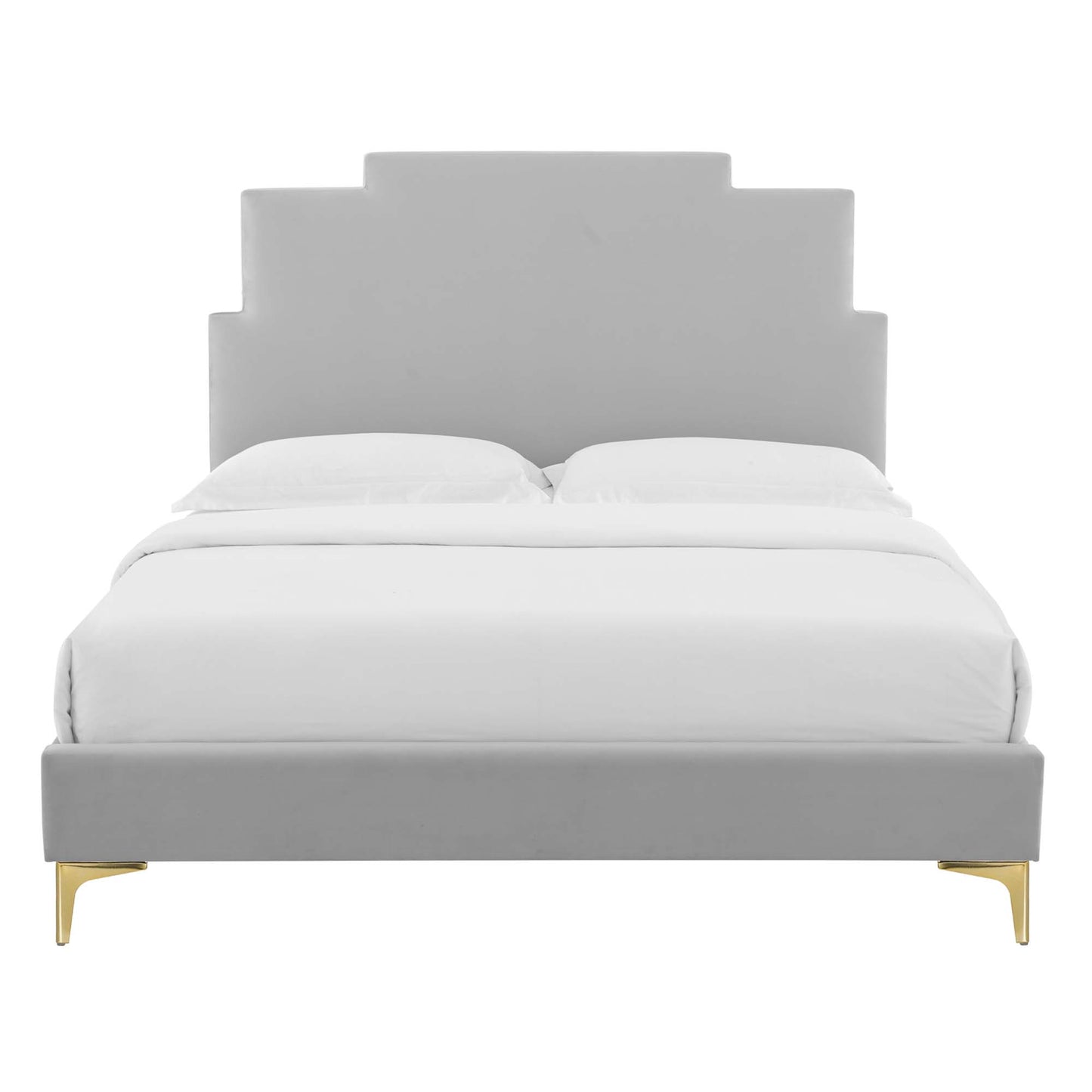 Elevate the style in your master bedroom or guest bedroom with the Lindsey Performance Velvet King Platform Bed. The padded headboard of this king size bed features luxe texture, clean lines, and escalating silhouette. Rich in glam deco style and vintage modern elegance, this upholstered bed is covered in stain-resistant performance velvet and is a sturdy mattress foundation for memory foam, innerspring, latex, and hybrid mattresses. Eliminating the need for a box spring, the MDF frame of this king platform bed is complete with a wood slat support system crafted with poplar for lasting durability and support. This slatted bed frame rests on gold metal legs with non-marking foot caps and includes a reinforced center beam with two support legs for enhanced stability. Assembly required. King Bed Weight Capacity: 800 lbs.