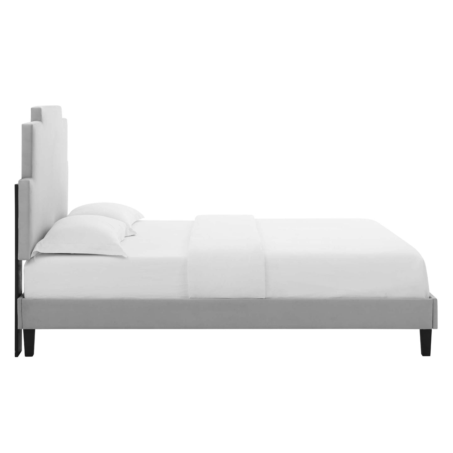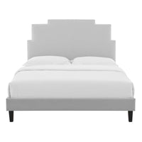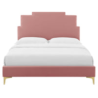 Elevate the style in a guest bedroom or kid's bedroom with the Lindsey Performance Velvet Twin Platform Bed. The padded headboard of this twin size bed features luxe texture, clean lines, and escalating silhouette. Rich in glam deco style and vintage modern elegance, this upholstered bed is covered in stain-resistant performance velvet and is a sturdy mattress foundation for memory foam, innerspring, latex, and hybrid mattresses. Eliminating the need for a box spring, the MDF frame of this twin platform bed is complete with a wood slat support system crafted with poplar for lasting durability and support. This slatted bed frame rests on gold metal legs with non-marking foot caps and includes a reinforced center beam with two support legs for enhanced stability. Assembly required. Twin Bed Weight Capacity: 800 lbs.