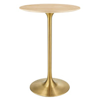 Let modern inspiration flow while gathered around the Lippa 28" Round Natural Bar Table. Perfect for entertaining family and friends or everyday dining, this pedestal bar table comfortably seats two. Its round tabletop is crafted with MDF and natural wood veneer and beveled edge for a contemporary yet timeless design. Embodying an iconic mid-century silhouette, this bar-height dining table floats on a sleek tapered metal pedestal base with a chip-resistant brushed gold finish. Includes non-marking felt pad to protect flooring. Assembly required.
