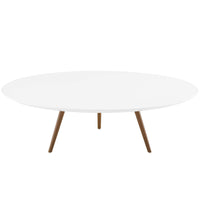 Reflecting a seamless organic shape and timeless form, the Lippa Table has become a symbol of modernism for over the past 60 years. Before its release, homes were filled with clunky remnants of an industrial age long gone by. But in order to advance into the new world, homes first had to transition from the traditional square table, into a piece that connoted progress. A twist on the original design, this coffee table features a round walnut veneer MDF table top lacquered with a scratch-resistant finish and tripod base with tapered walnut stained dowel legs. This rendition of Lippa is a coffee table that's perfect for the living room, lounge area, or home office.