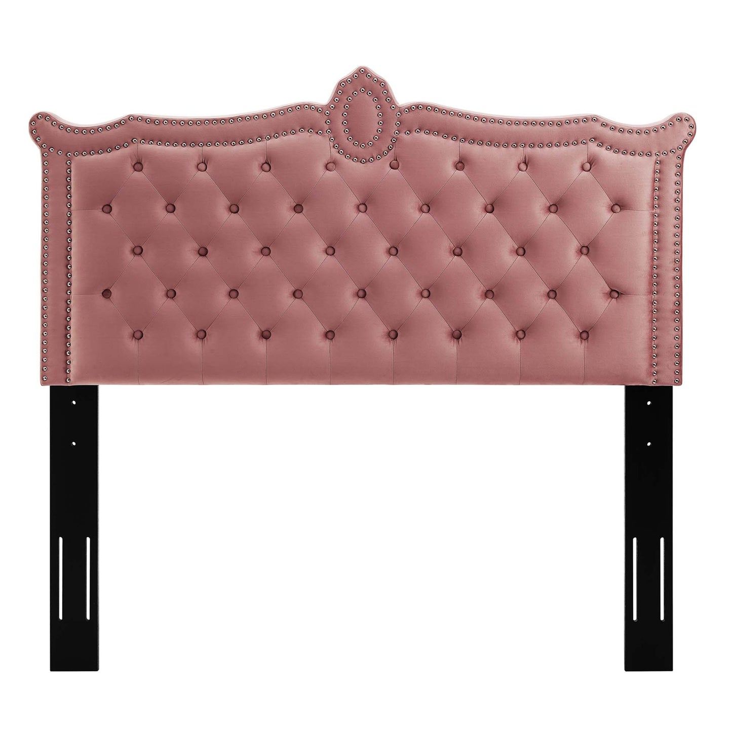 Elevate your master bedroom or guest bedroom decor with the opulent style and glam deco elegance of the Louisa Tufted Performance Velvet King/California King Headboard. Featuring classic button tufting, nailhead detail, and an ornate silhouette, this king/California king size headboard is rich in velvety texture and royal charm. This padded headboard features dense foam and soft, stain-resistant velvet upholstery granting supportive comfort while sitting up in bed resting and relaxing. A beautiful backdrop for a variety of bedding styles, this adjustable headboard king or California king bed frames with its three mounting positions. Assembly required.