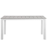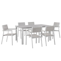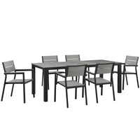 Bordered by the Atlantic Ocean rests the Maine Outdoor Patio Dining Furniture Collection. Distinguished by its synthetic wood grain plank boards, powder-coated aluminum frame, inspired design, and rich organic feel, Maine Outdoor Dining Set stands out as a versatile series for outdoor dining. This contemporary modern patio dining set is perfect for contemporary patios, backyards, poolside, and other outdoor lounge areas.