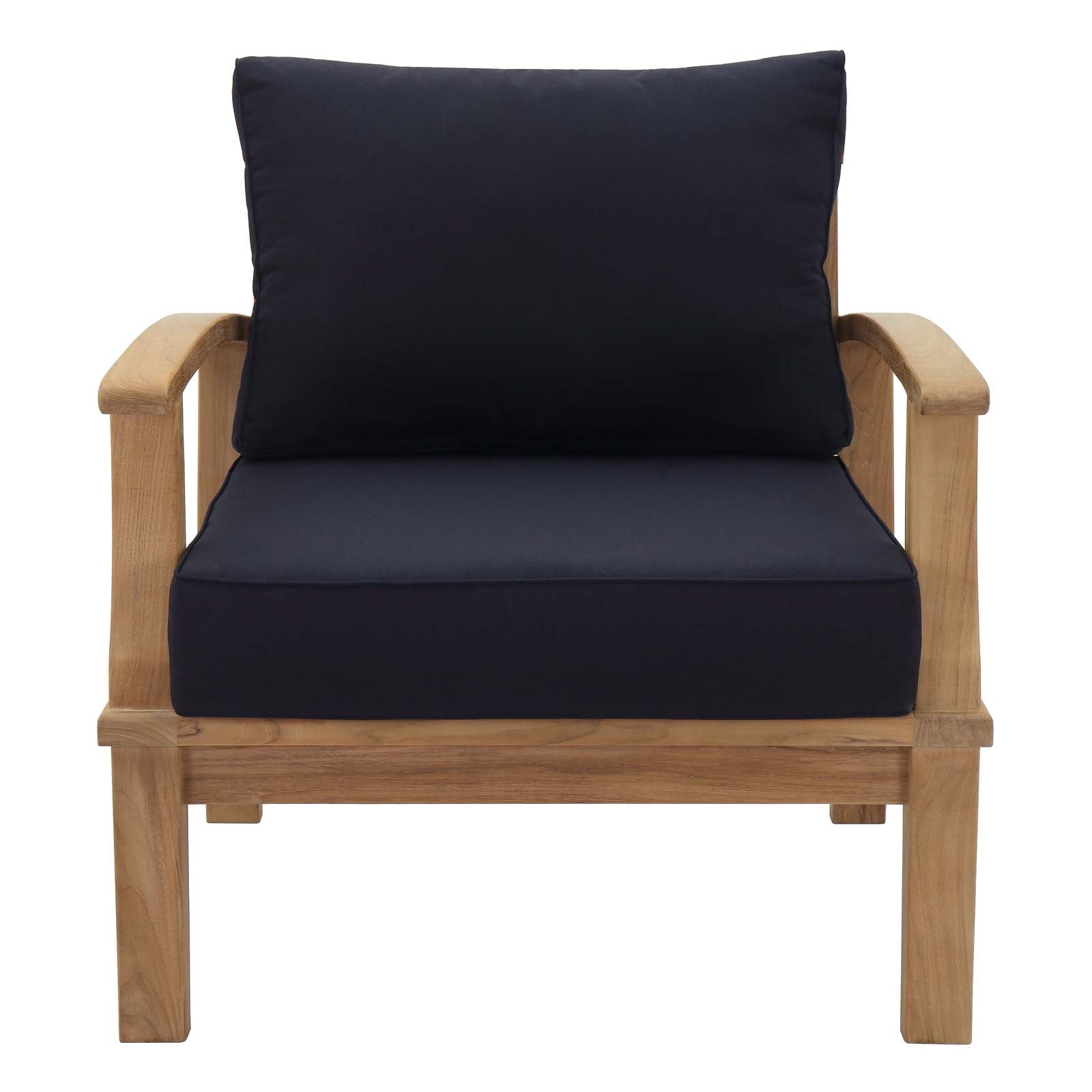 Harbor your greatest expectations with the luxurious Marina Teak Wood Outdoor Patio Arm Chair. Marina Patio Arm Chair has a seating arrangement perfect for every member of your crew as you breathe the fresh, crisp air of a day spent with friends and family. Known for its natural ability to withstand extreme weather conditions, teak is the wood selection of choice for long-lasting outdoor patio furniture. Now you can enjoy Marina Teak Wood Outdoor Arm Chair with its durable construction and all-weather cushions. Assembly required. Please note that while the covers on your new outdoor set are composed of strongly water-repellent material, if left out in the rain or within the range of sprinklers, they will absorb moisture through the seams. We suggest covering or storing your new cushions indoors when not in use. If the cushions do get wet, stand them on their sides to allow the water to drain out. For cleaning, use only mild dish soap and water, never use harsh chemicals.