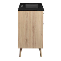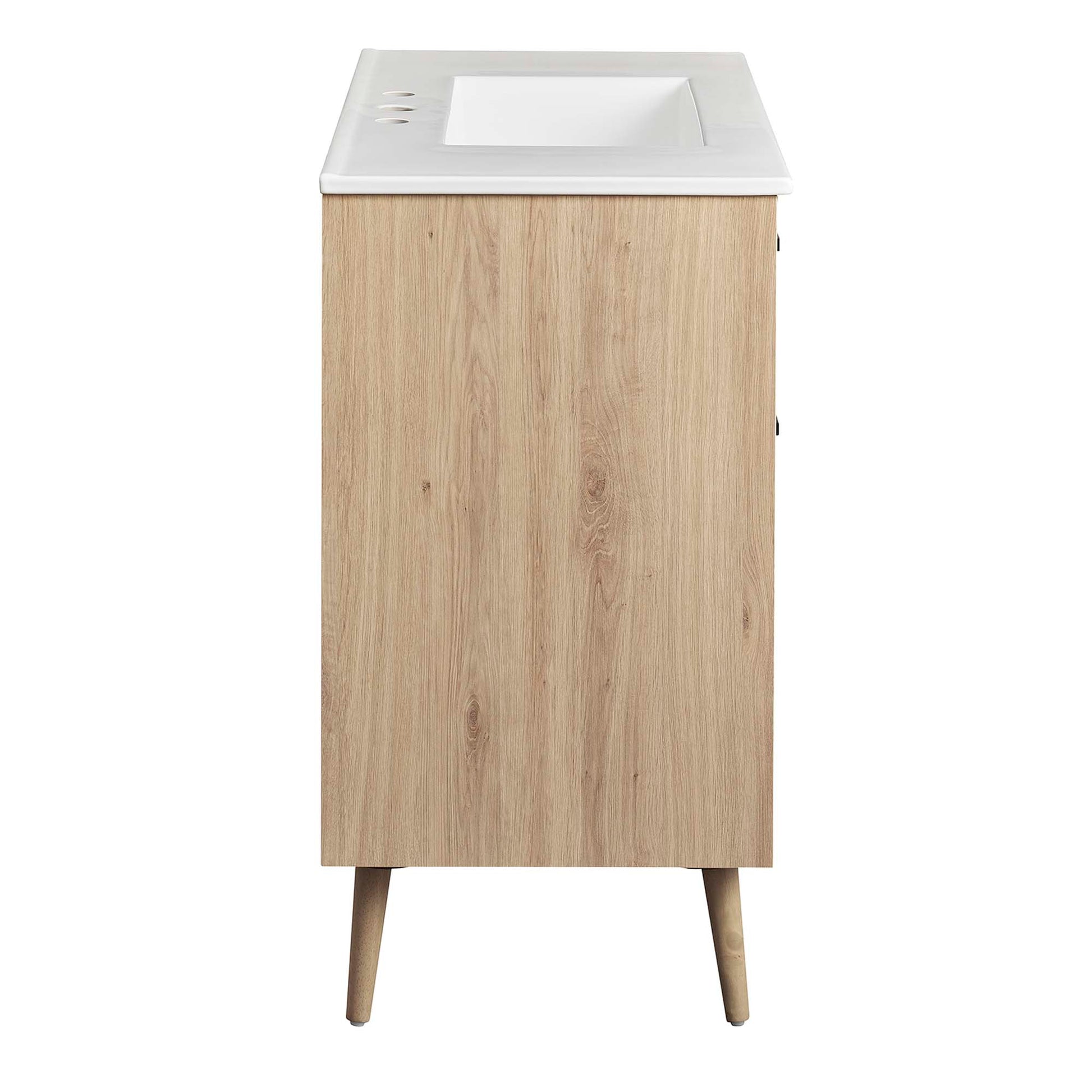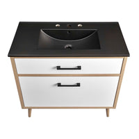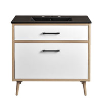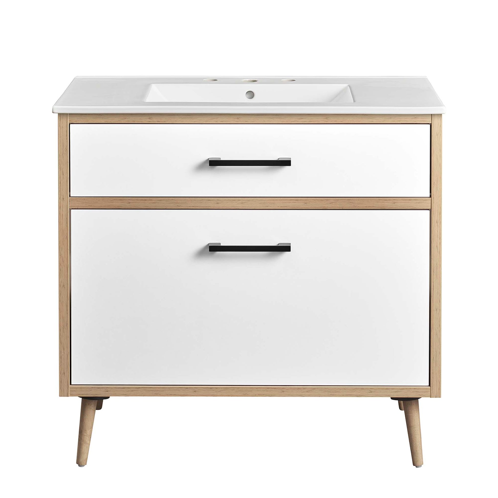 The Maverick 36" Bathroom Vanity is the perfect blend of modern style and convenience. Crafted with particleboard and melamine, the simple yet elegant design is enhanced by modern metal handle pulls and tapered and splayed rubberwood legs. The spacious full-glide bottom drawer provides plenty of storage space for all your bathroom essentials, while the fixed top drawer adds complementing style. This bathroom vanity cabinet features a ceramic sink basin with an integrated countertop and 8" centerset faucet holes. This bathroom vanity instantly transforms your space, creating a beautiful, modern look that will last for years. Includes non-marking foot glides to protect flooring. Assembly required. Fixtures not included.