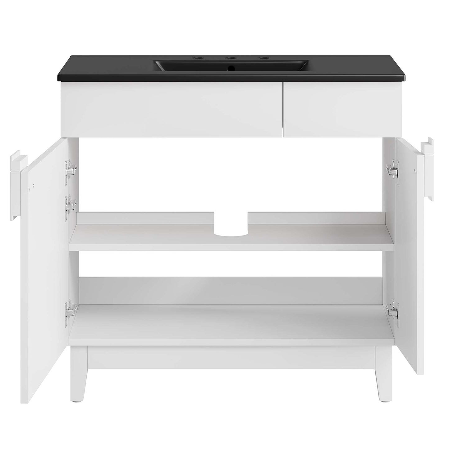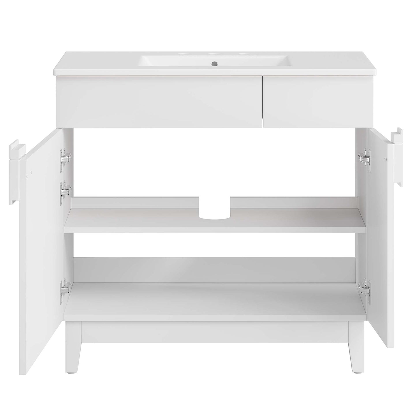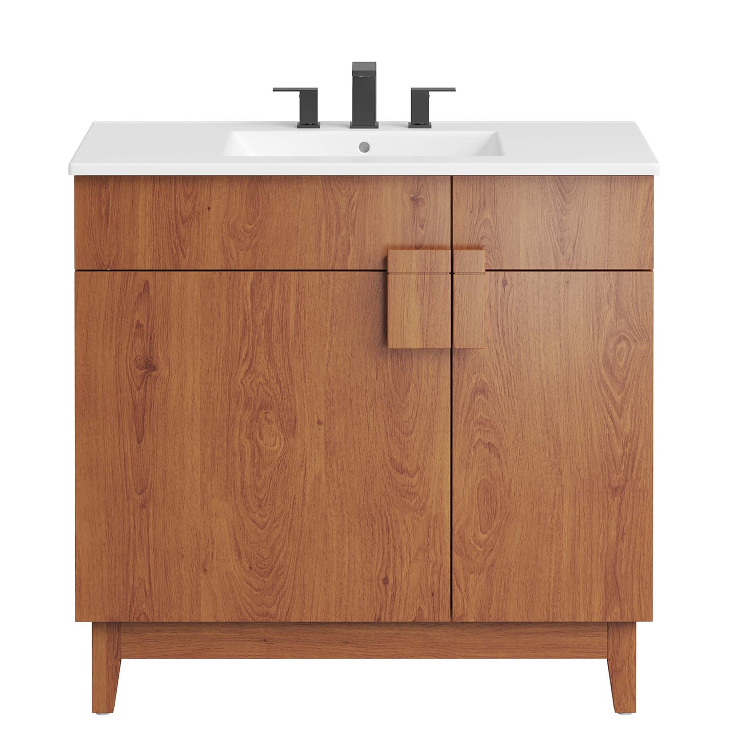 Update your bathroom decor with the modern allure of the Miles 36" Bathroom Vanity. Made from particleboard adorned with a sleek melamine laminate, this vanity stands on four tapered rubberwood legs, equipped with non-marking tack glides to protect flooring. Featuring a curved ceramic basin sink with an integrated countertop and 8-inch centerset faucet holes, this vanity is a complete bathroom upgrade. The unique design showcases two metal hinged doors, featuring an intriguing asymmetrical layout, and accentuated by a split square handle for a modern touch. Inside, you'll find ample storage on two spacious shelves, perfect for organizing bathroom essentials. Miles features a cut-out design to accommodate plumbing. Fixtures not included. Assembly required. Weight Capacity: 200 lbs.