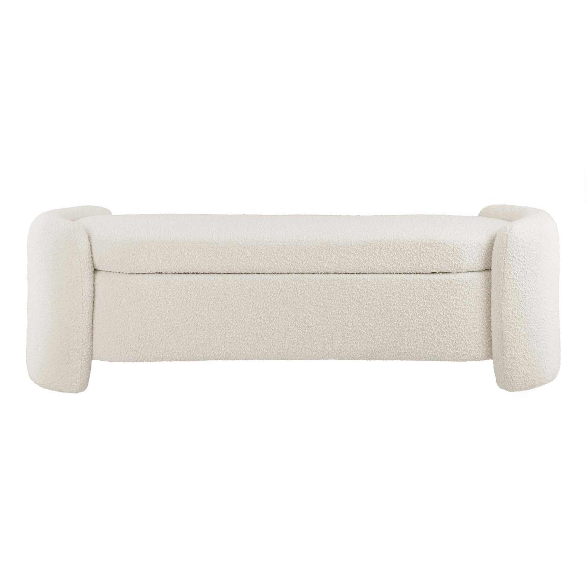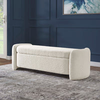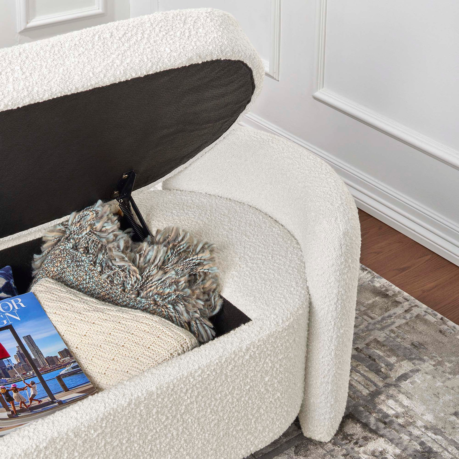 Relax amidst trending style and modern comfort with the Nebula Boucle Upholstered Accent Bench. Bringing appreciated texture to your living space, entryway, bedroom, office, or other seating area, this accent bench is upholstered in a beautiful boucle fabric made with looped yarns to create its charming nubby texture. Dense foam padding offers a premium seating experience and is perfect for kicking up your feet and relaxing. This storage bench has a hinged seat with 80º angle to reveal the spacious storage area perfect for hiding TV remotes, an extra blanket, magazines, books, and more.