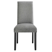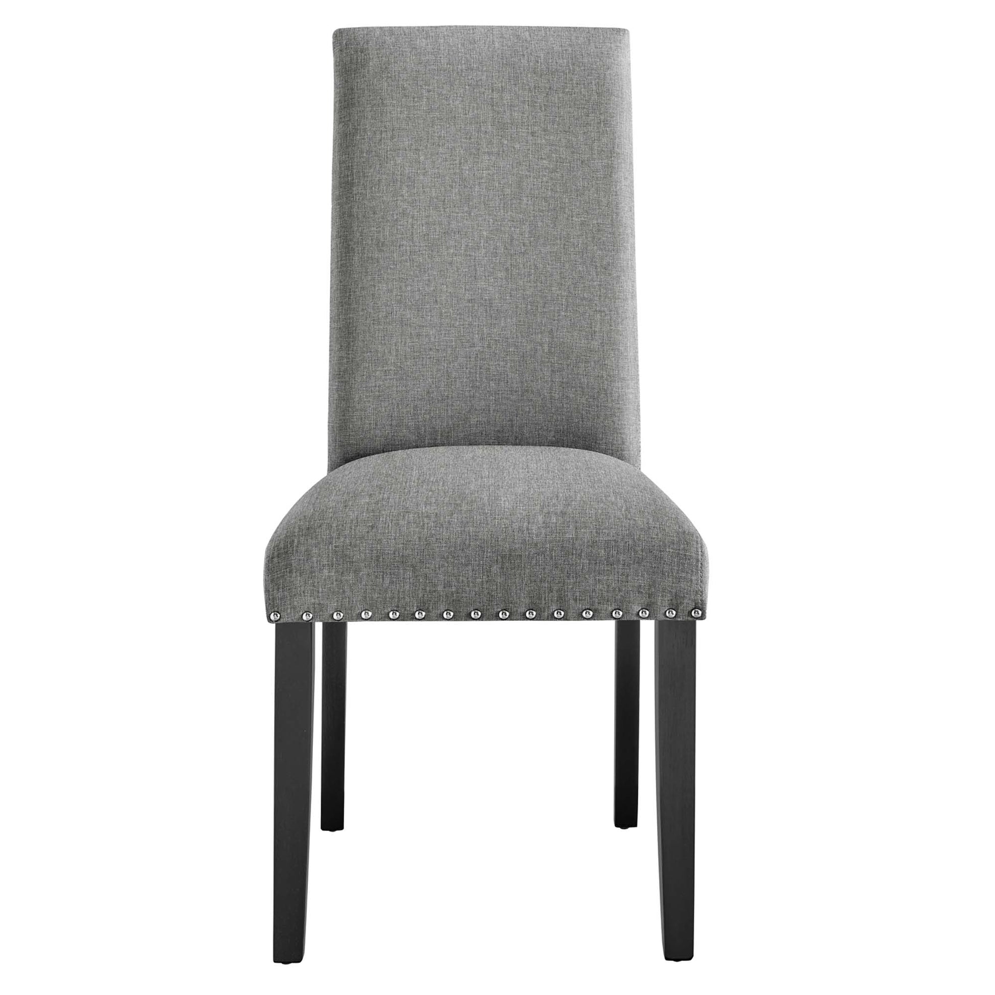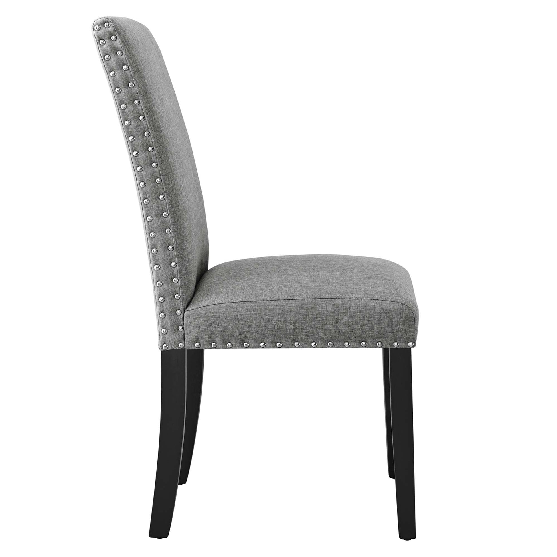 Wrap up moments of quality seating with the Parcel Upholstered Fabric Dining Room Side Chair. Finely upholstered in soft and durable fabric polyester upholstery with elegant nailhead trim, the Parcel Accent Chair delivers a modern offering that enhances the dining room experience. Padded with dense foam and supported by espresso stained tapered wood legs, the Parcel Dining Chair is a stylish addition to your dining room, living room, lounge room, or office. Chair Weight Capacity: 285 lbs. Assembly Required.