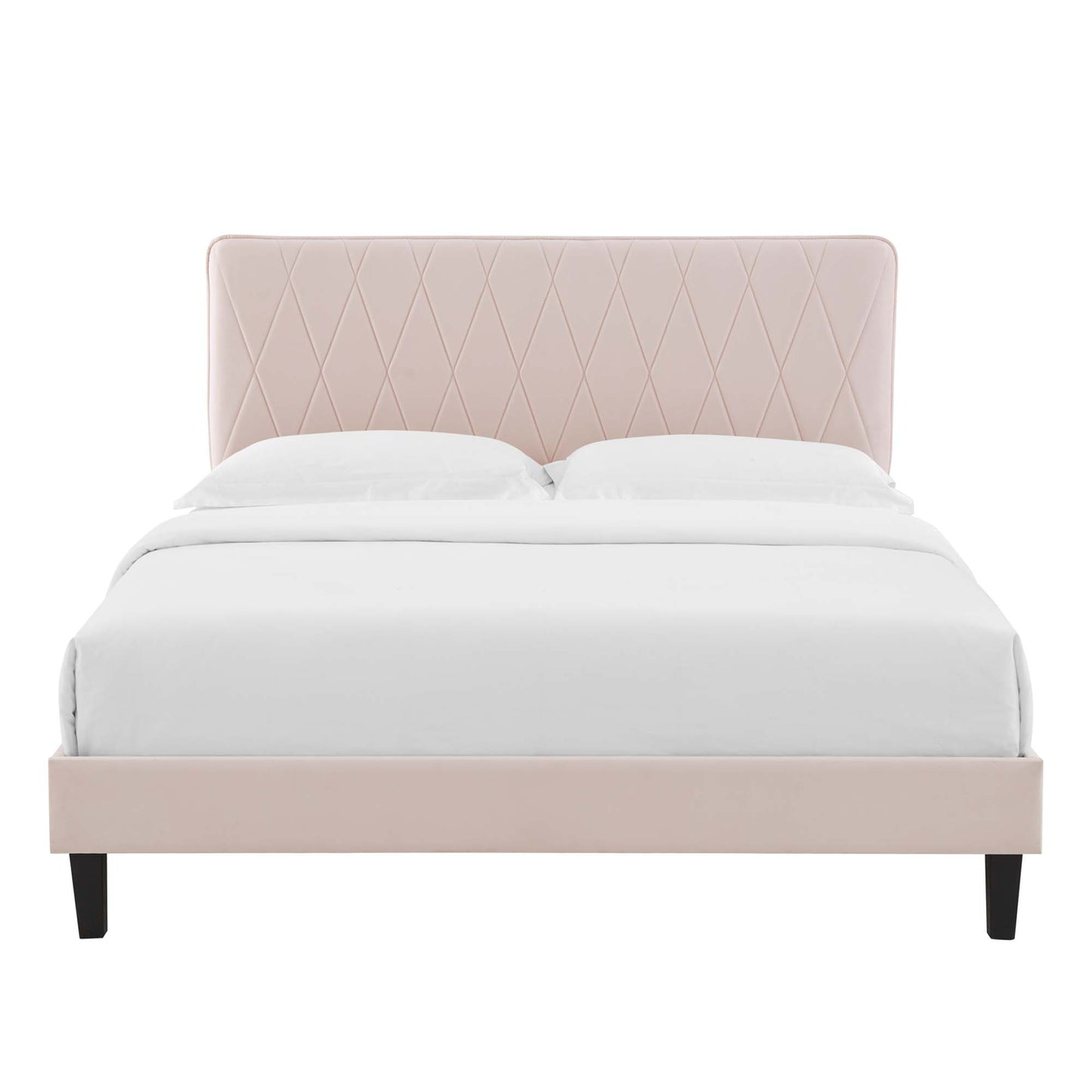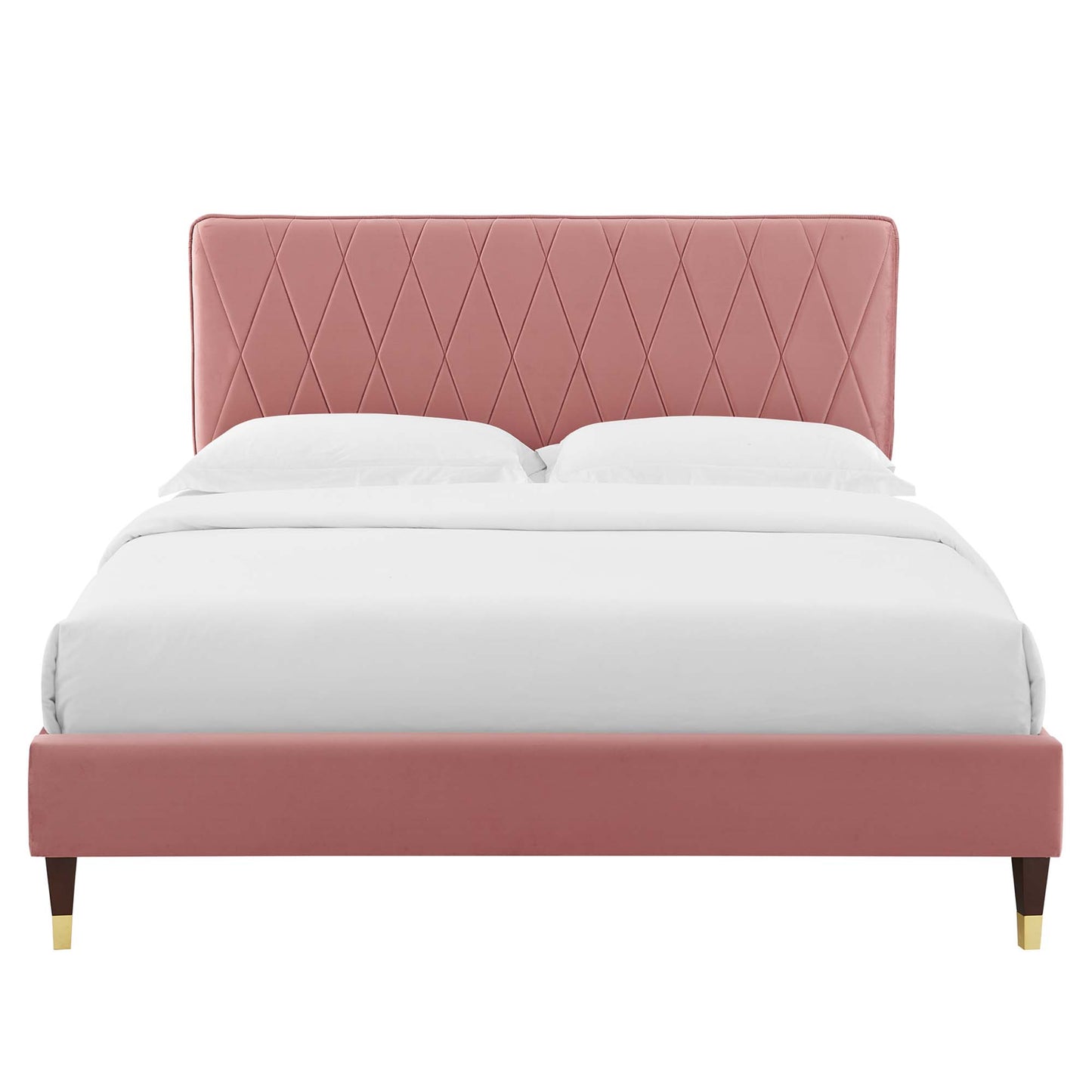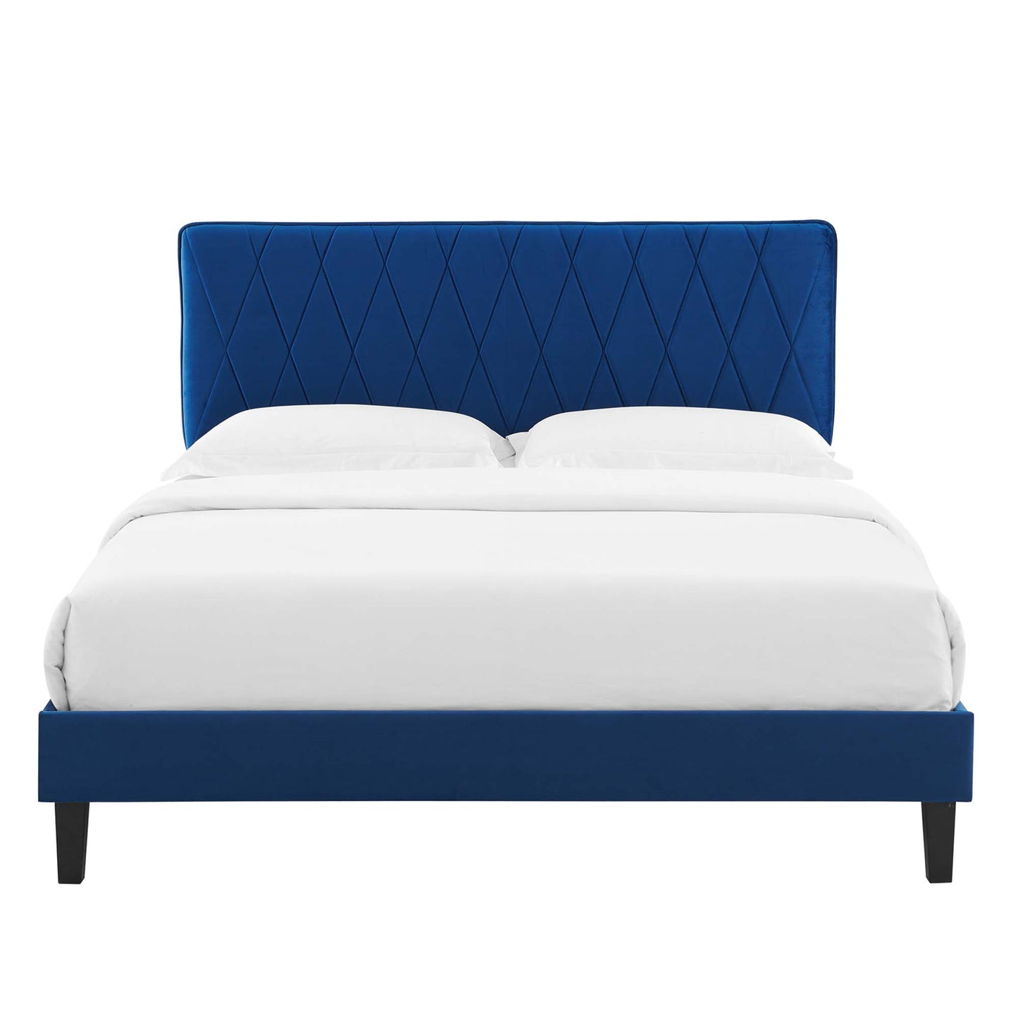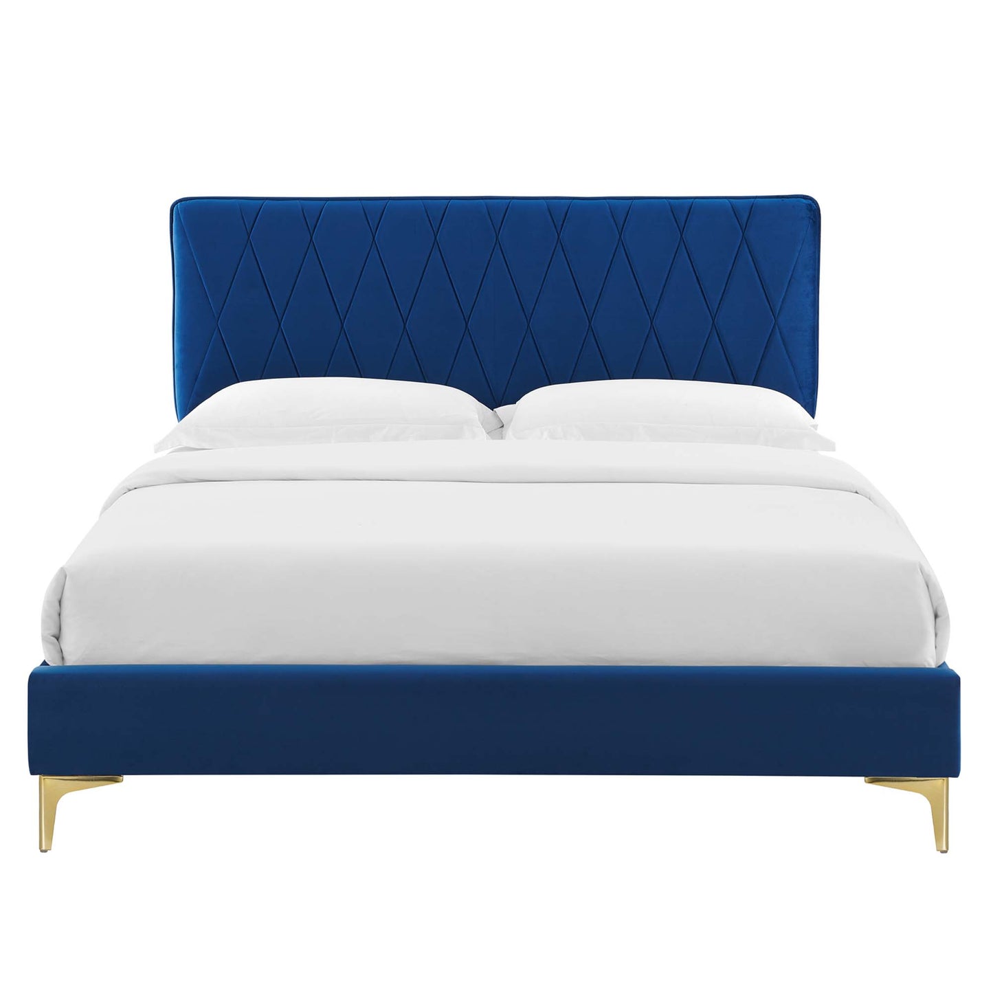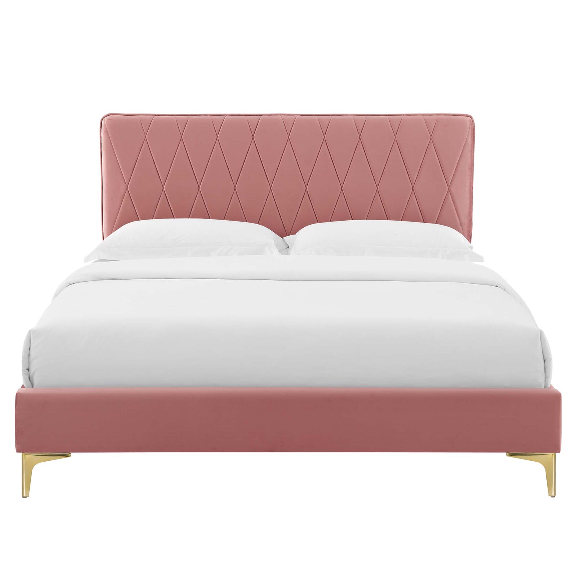Offer glam deco style and vintage modern elegance to your master bedroom or guest bedroom decor with the Phillipa Performance Velvet Queen Platform Bed. The padded headboard of this queen size bed features a beautiful intersecting diamond design. Rich in glam deco style and vintage modern elegance, this upholstered bed is covered in stain-resistant performance velvet and is a sturdy mattress foundation for memory foam, innerspring, latex, and hybrid mattresses. Eliminating the need for a box spring, the MDF frame of this queen platform bed is complete with a wood slat support system crafted with poplar for lasting durability and support. This slatted bed frame rests on gold metal legs with non-marking foot caps and includes a reinforced center beam with two support legs for enhanced stability. Assembly required. Queen Bed Weight Capacity: 800 lbs.