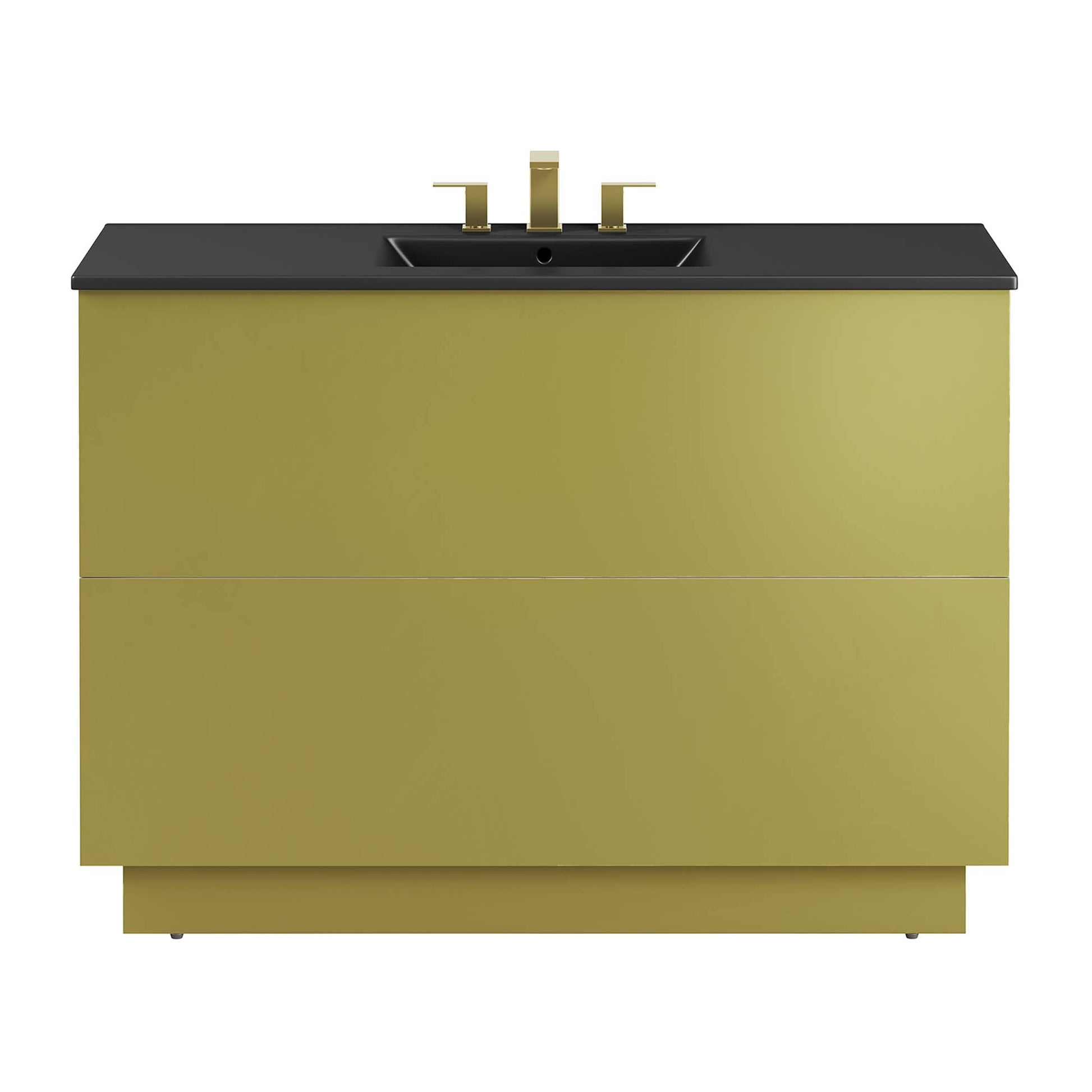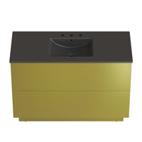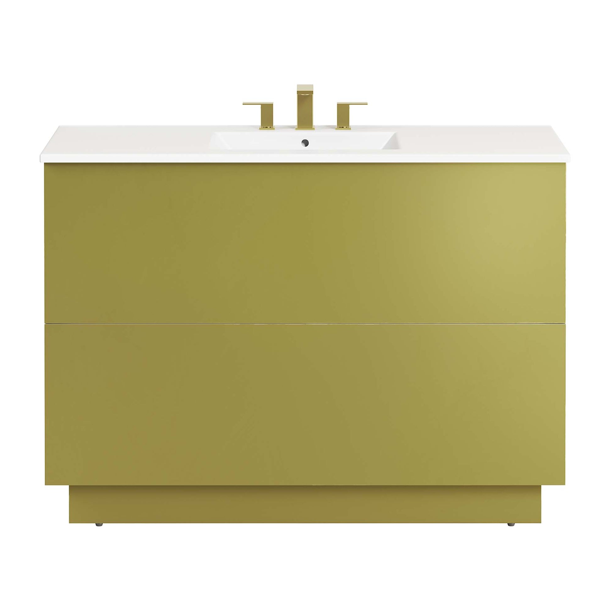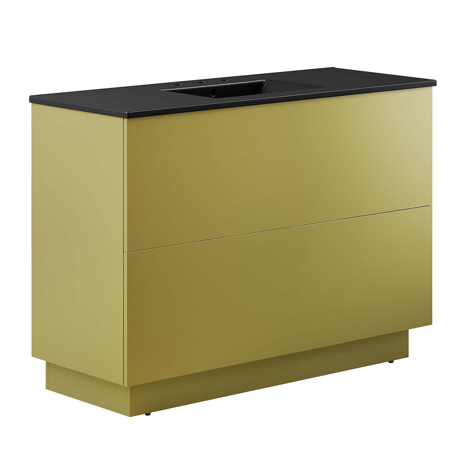 Experience a harmonious blend of luxury and practicality with the Quantum 48" Bathroom Vanity. This modern bathroom vanity features a sleek ceramic single sink basin with 8" centerset holes and integrated countertop, awaiting your personalized fixture choices (not included). Durably crafted from MDF and showcasing a refined gold finish, this vanity cabinet radiates sophistication. A spacious full-glide drawer offers ample storage for bathroom essentials, complementing the sleek design. Assembly is required, promising a rewarding setup for this functional, modern vanity.