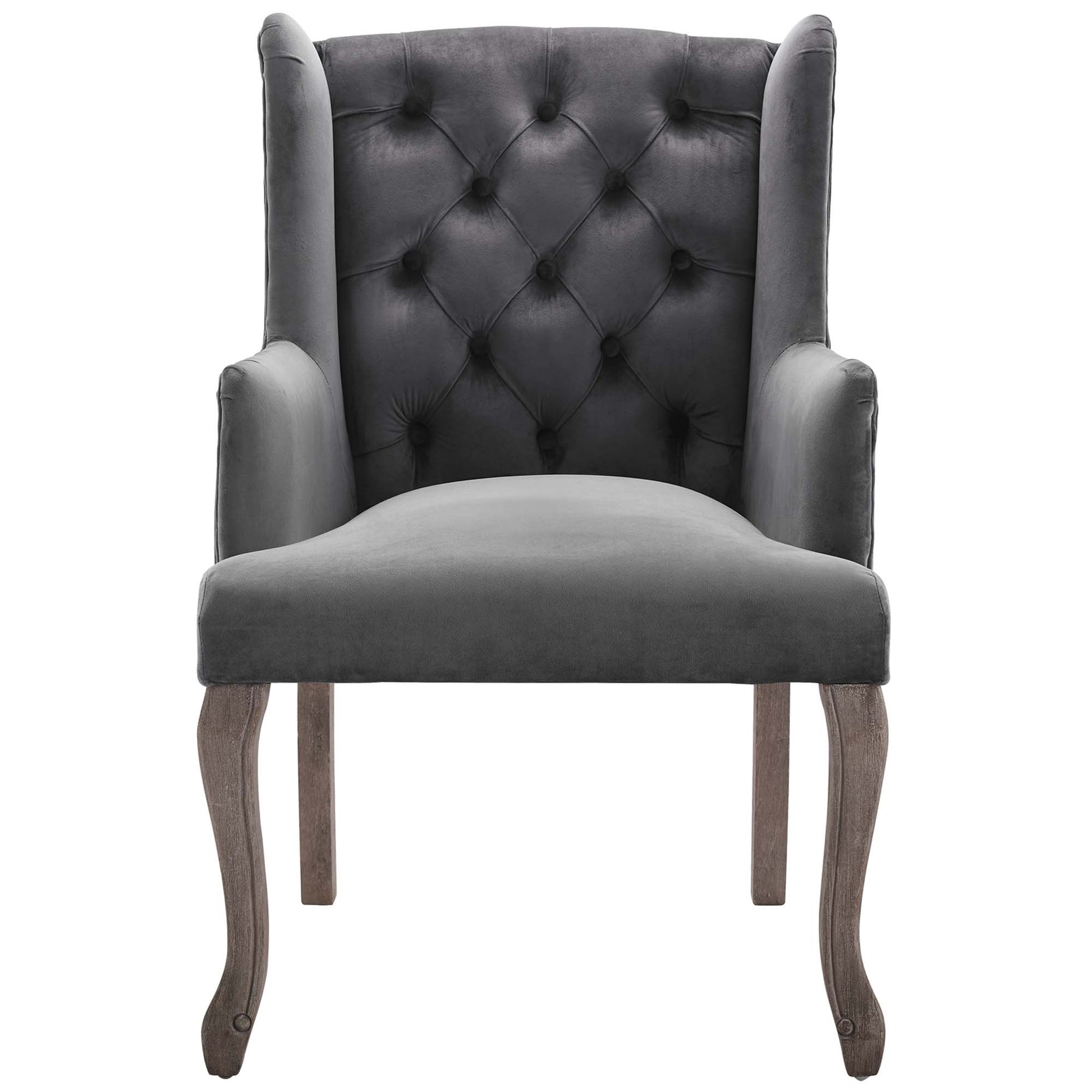 Elevate your living room, entryway, bedroom or home office decor with the Realm French Vintage Performance Velvet Dining Armchair. Elegantly designed with deep-button tufting, weathered wood cabriole legs with chiseled artisan detail, this wingback chair makes a chic statement with timeless detail and modern farmhouse intrigue. Finely upholstered in stain-resistant performance velvet with dense foam padding, charming French piping, and a sinuous spring support system for exceptional comfort, Realm creates a cozy spot to sit back and relax. Realm includes plastic foot caps. Armchair Weight Capacity: 300 lbs.