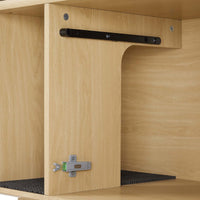 Tap into mid-century aesthetics with the Render Cat Cabinet, an ideal solution for your cat litter box needs. This sturdy cat litter furniture piece features a durable MDF and particleboard frame with a smooth wood grain laminate, perfect for blending into your home decor. This pet cabinet includes two full-extension drawers, ideal for storing cat supplies or other small items, and a retractable slatted door with a push-to-open locking mechanism, offering discreet coverage for a hidden litter box while providing easy access for cleaning. The open compartment, fitted with a non-slip mat, includes a cutout leading to the cat litter box (litter box not included), allowing your cat to easily enter and exit while keeping the area clean and tidy. Additionally, the slatted door allows for ventilation and some light, making it a comfortable, enclosed litter box space for your cat. The Render cat cabinet is equipped with non-marking foot pads, protecting your floors and providing stability. Designed for easy assembly, this stylish and functional piece is perfect for keeping your living space neat. Customers can also purchase a separate litter box mat to place in front of the litter box cabinet, enhancing cleanliness and further reducing tracked litter around the home. Ideal for any modern pet owner's home, office, or apartment, the litter enclosure supports up to 71 lbs on the bottom shelf. Litter box not included.