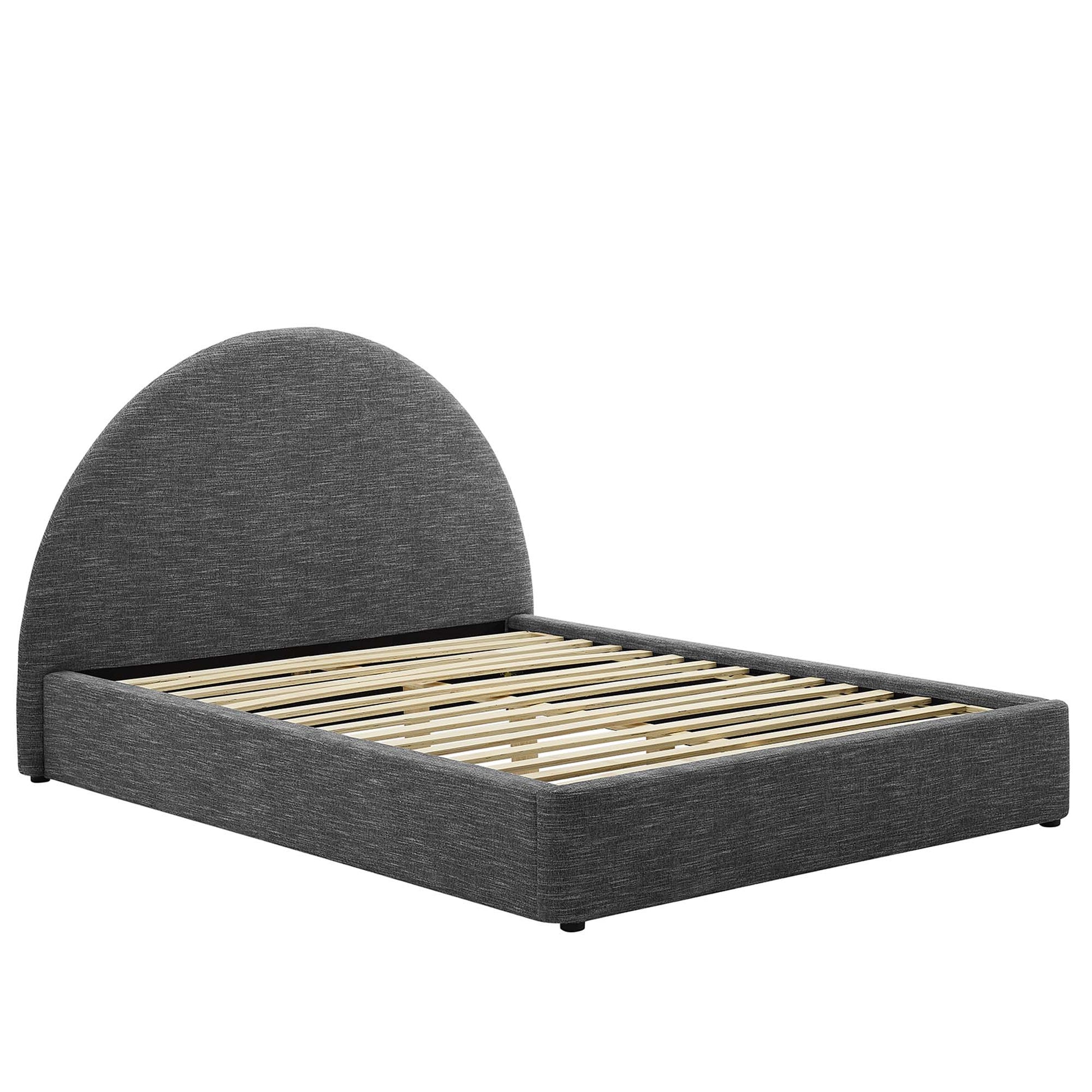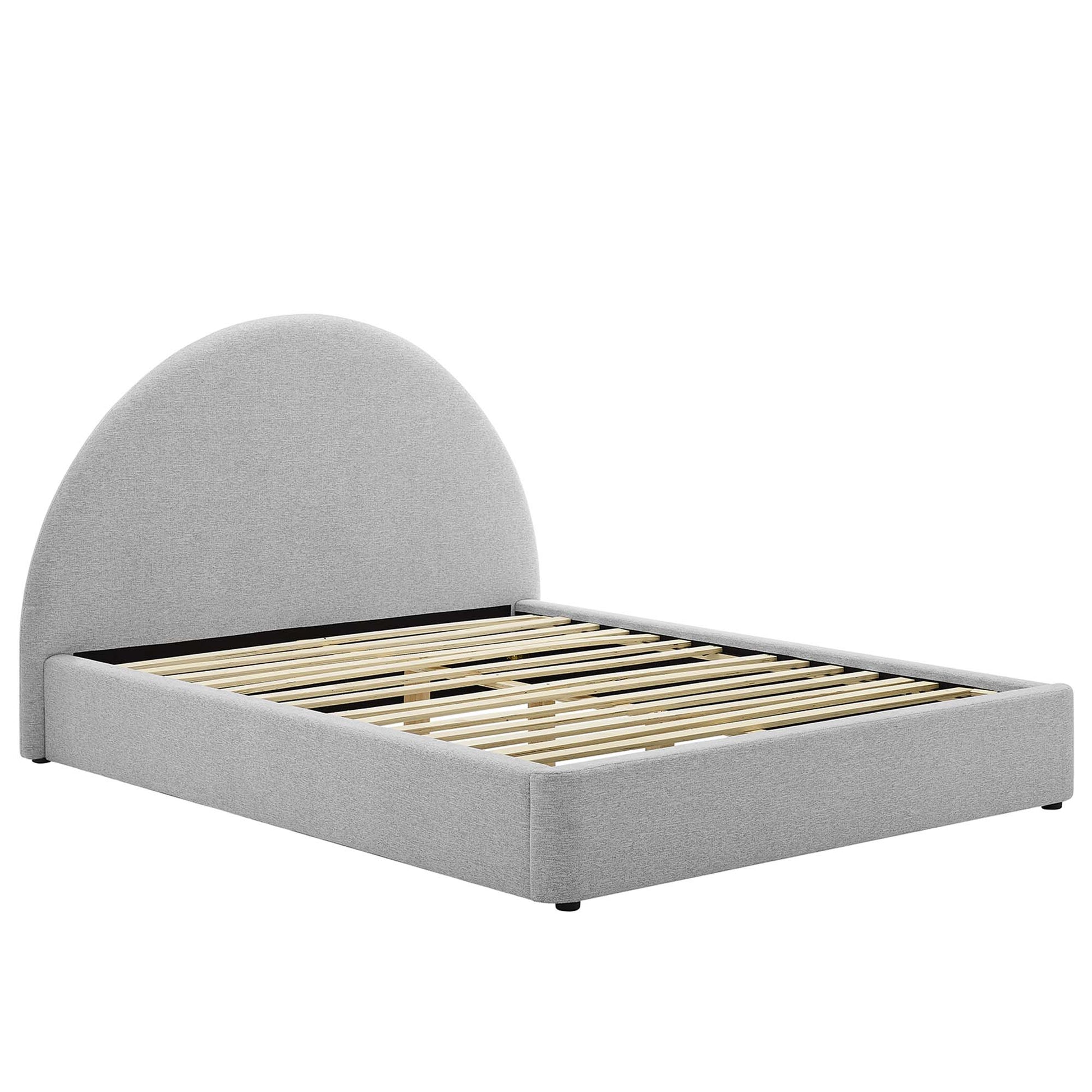 Step into a world of cozy elegance with the Resort queen size platform bed. This queen bed features a unique arched headboard that brings a fresh perspective to a guest suite, spare room or primary bedroom. Upholstered in woven heathered fabric and cushioned with dense foam, this queen platform bed frame fits various decor styles and offers the luxurious comfort characteristic of a cloud bed. The MDF frame of this upholstered platform bed, equipped with a wood slat support system, removes the necessity for a box spring. Its solid queen bed frame makes the Resort arch shaped round bed great for memory foam, innerspring, latex, and hybrid mattresses, providing sturdy support. Outfitted with LVL legs, each queen bed frame with headboard comes with non-marking caps to safeguard your floors, blending strength with a sleek, contemporary appearance. Mattress not included. Assembly required. Bed Frame Queen Size Weight Capacity: 800 lbs.