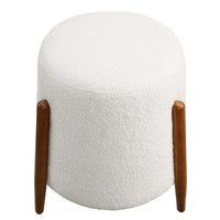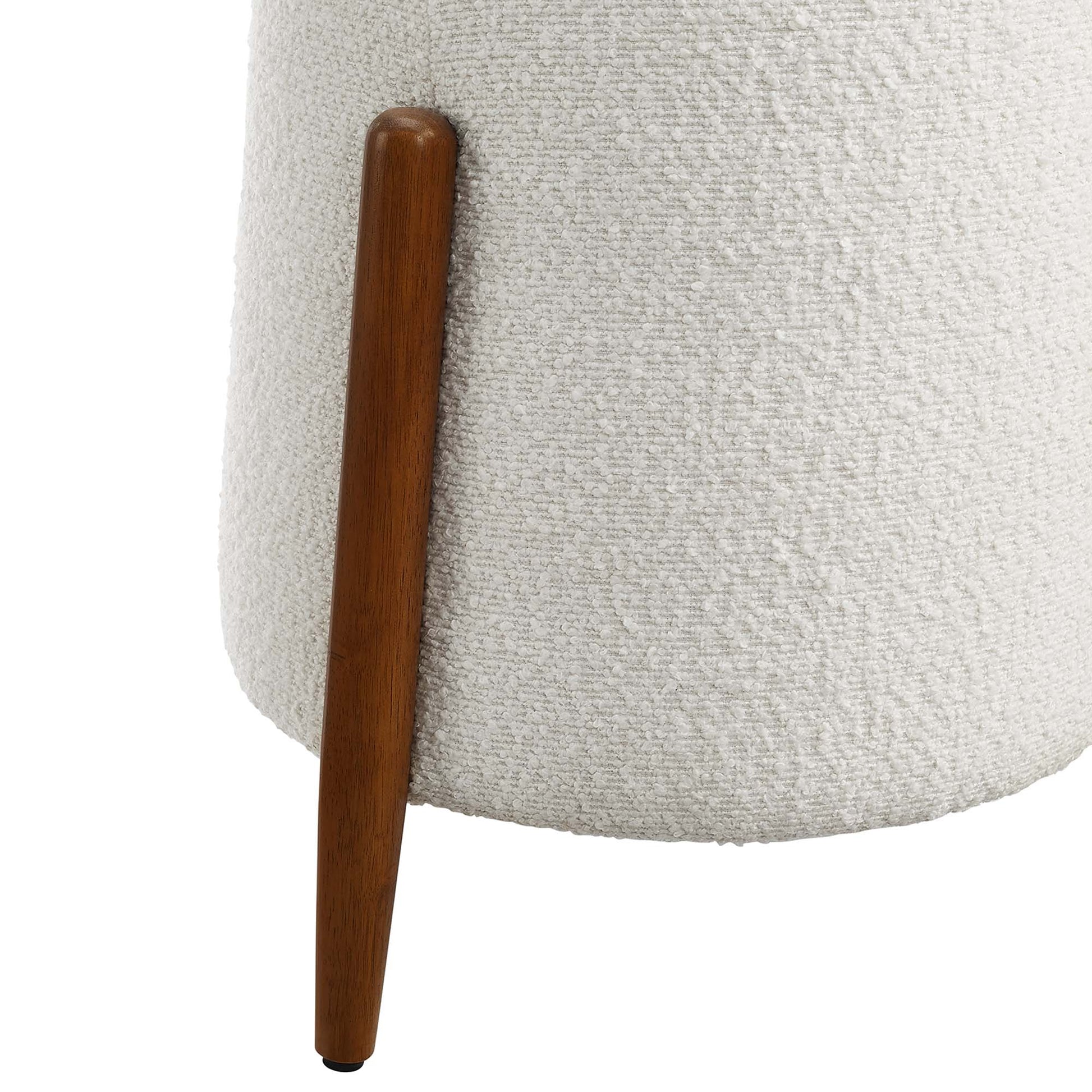 Immerse your living space in the sophisticated comfort of the Riven Ottoman. Upholstered in textured boucle fabric, this foam-padded, round ottoman stool radiates an air of elegance with a hint of modern panache. With its gentle curves and soft silhouette, this foot pouf ottoman stands on three tapered wood legs, elegantly affixed to the exterior of the footrest, providing a stable foundation while enhancing the piece’s overall shape with their sleek, splayed design. Whether it's accompanying your favorite armchair as a charming ottoman side table, used as an elegant vanity stool, or acting as a decorative ottoman in your living room, Riven's petite stature is designed to fit into any decor, offering a multifunctional ottoman for everyday needs. Celebrate the seamless blend of texture and form with this exquisite boucle ottoman, bound to become a cherished addition to your home furniture collection. Assembly Required. Weight Capacity: 264 lbs.