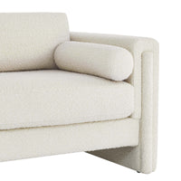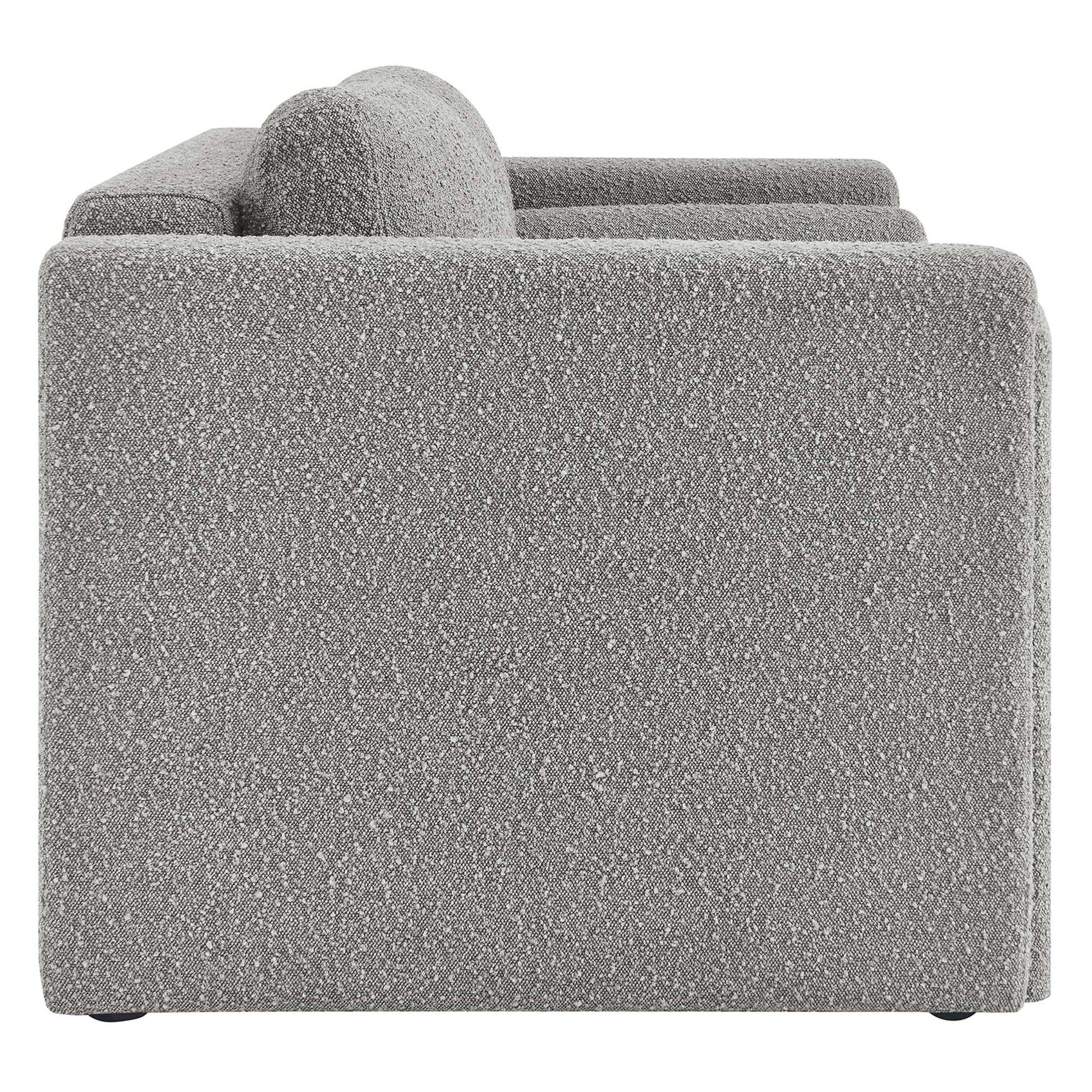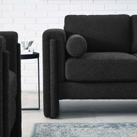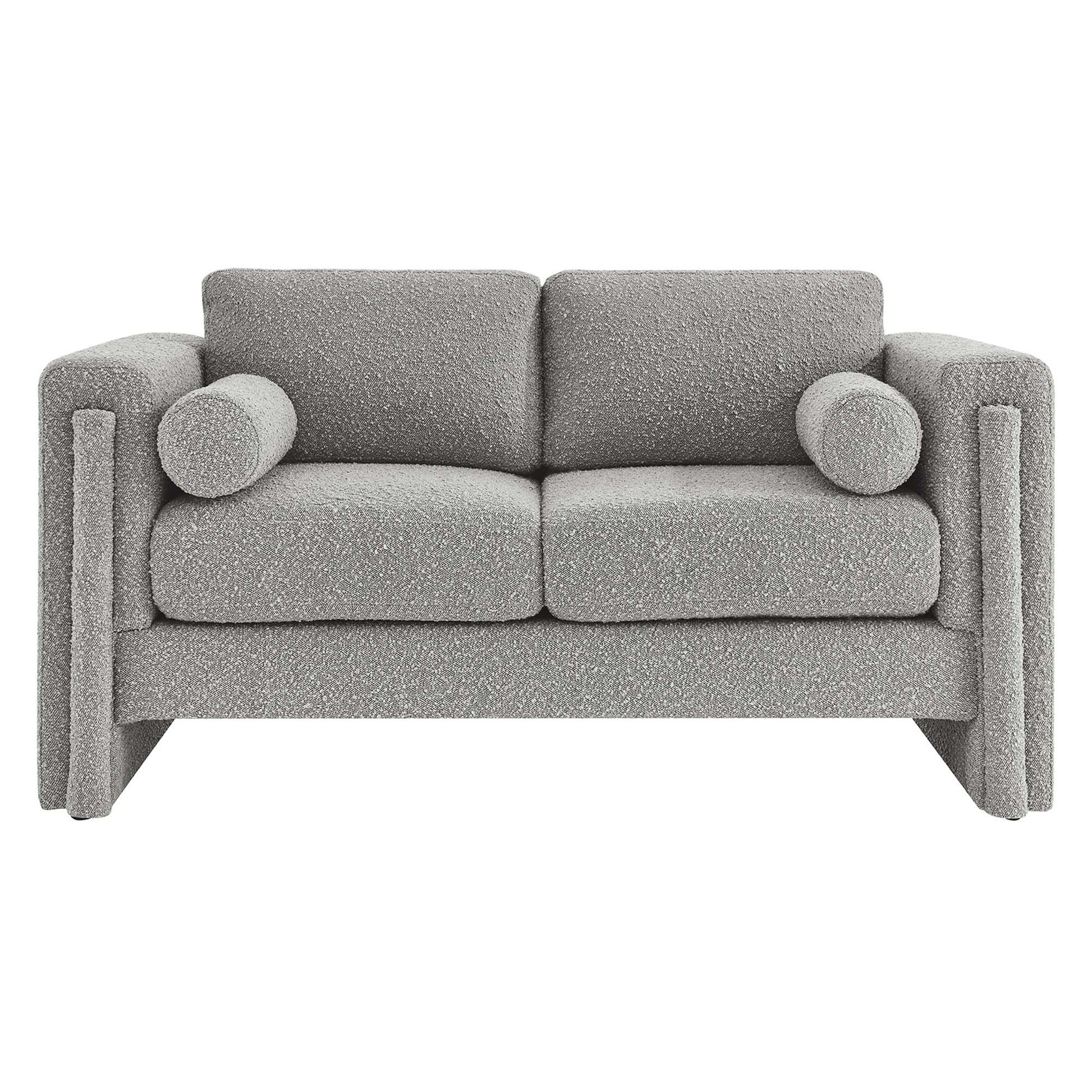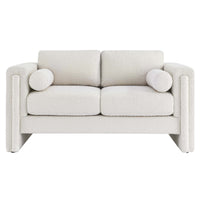 Indulge in the epitome of modern luxury and sophistication with the Visible Boucle Upholstered Loveseat. Crafted with a sturdy wood and plywood frame, this loveseat exudes modern elegance with its sleek lines, tailored silhouette, and bolster pillows. The adjustable non-marking foot pads protect your flooring while providing sturdy stability. Sink into cozy comfort with the dense foam padding, individualized pocket spring support, and durable boucle fabric upholstery with a charming nubby texture on this two-seater sofa. The cushions and cushion covers are zippered and removable. Enjoy unmatched support with the pocket coil springs that offer a premium seating experience. Assembly is required with easy to follow assembly instructions. Weight Capacity: 660 lbs.