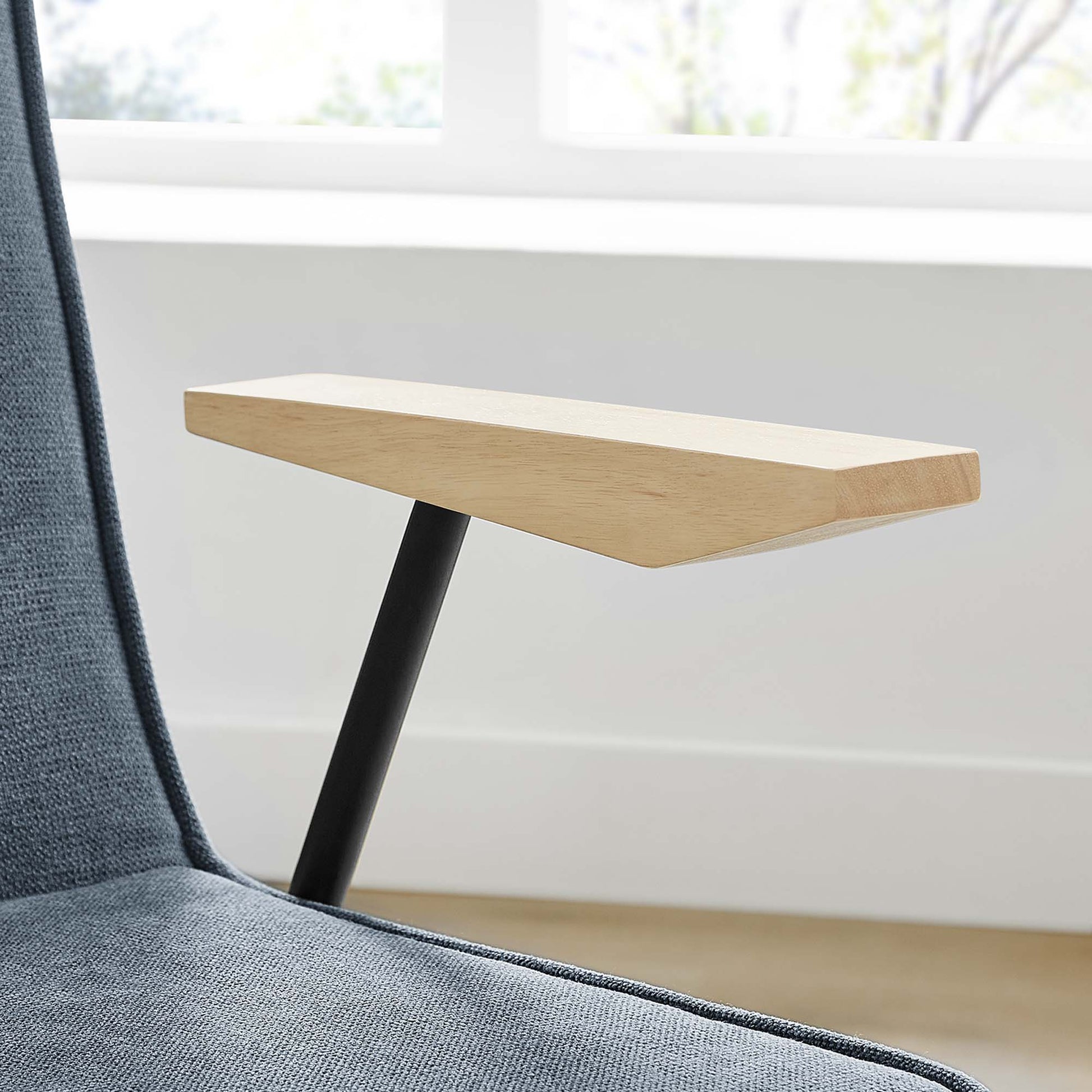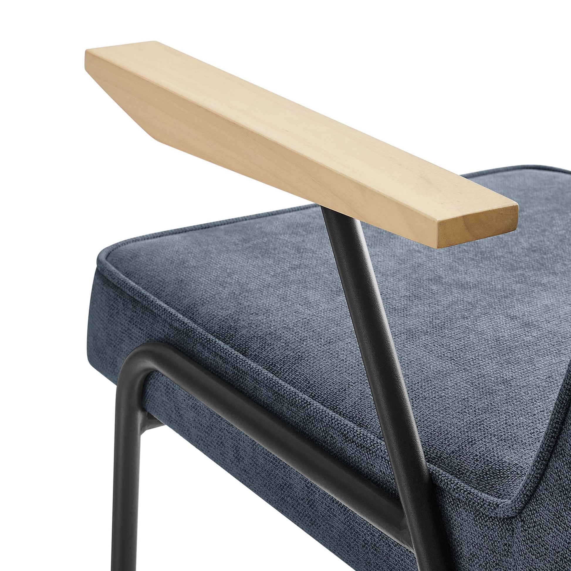 Perfect for various settings in the dining room or living room, the Vista Dining Chair offers a seamless blend of functionality and style. Its powder-coated metal frame grants durability, while the wooden arms add a touch of warmth, epitomizing mid-century modern flair. This metal and wood armchair has an upholstered fabric seat, complete with dense foam padding, French piping trim, and a comfortable recline, inviting you to sit back and relax. Equipped with non-marking foot glides, the Vista upholstered dining chair with arms protects your floors from scratches. Whether used as a dining armchair, an accent chair in the living room, or a waiting room chair, Vista stands out for its comfort and versatility, making it an essential modern addition to any space. Assembly required. Weight Capacity: 500 lbs.