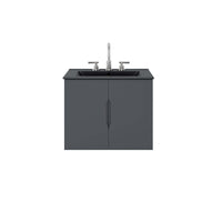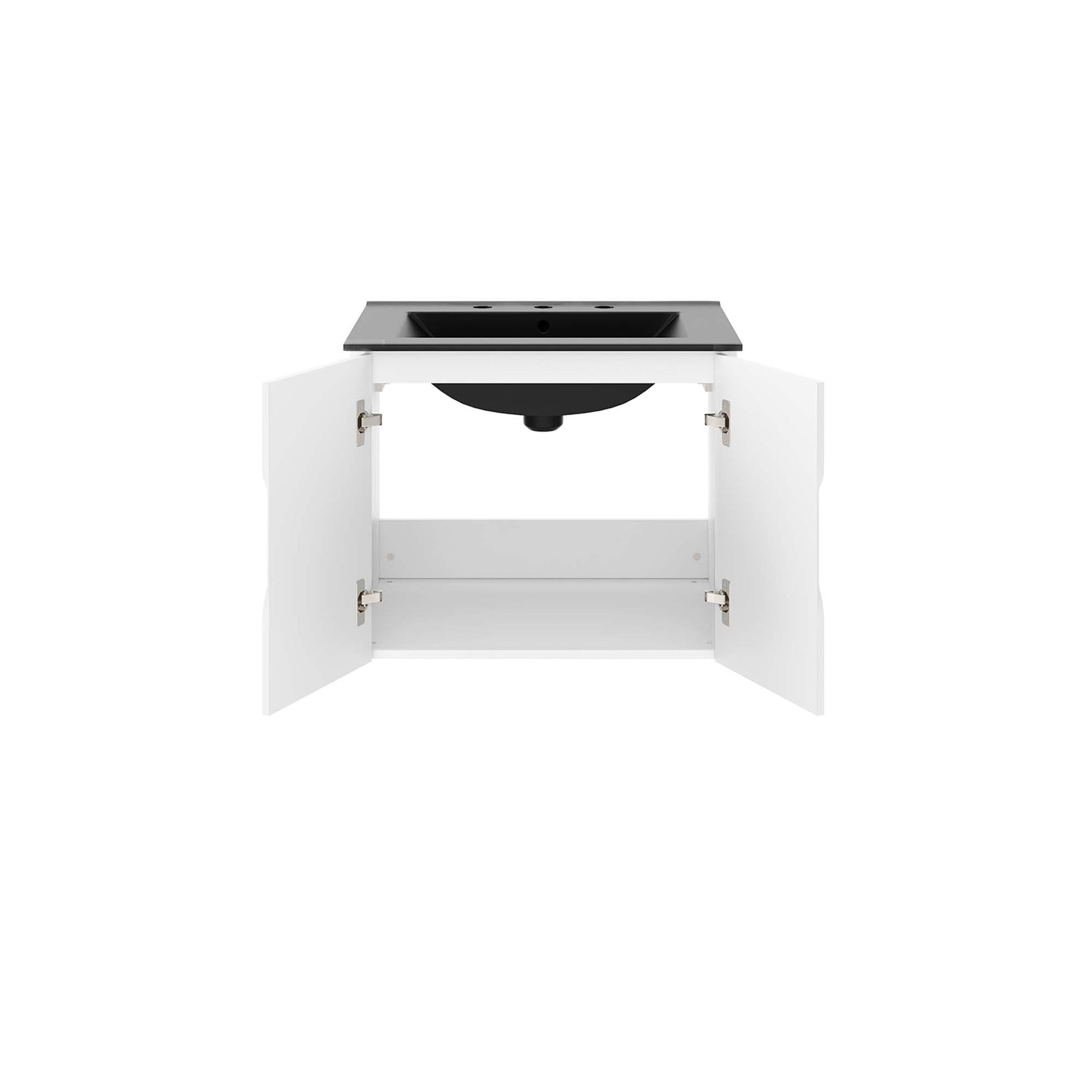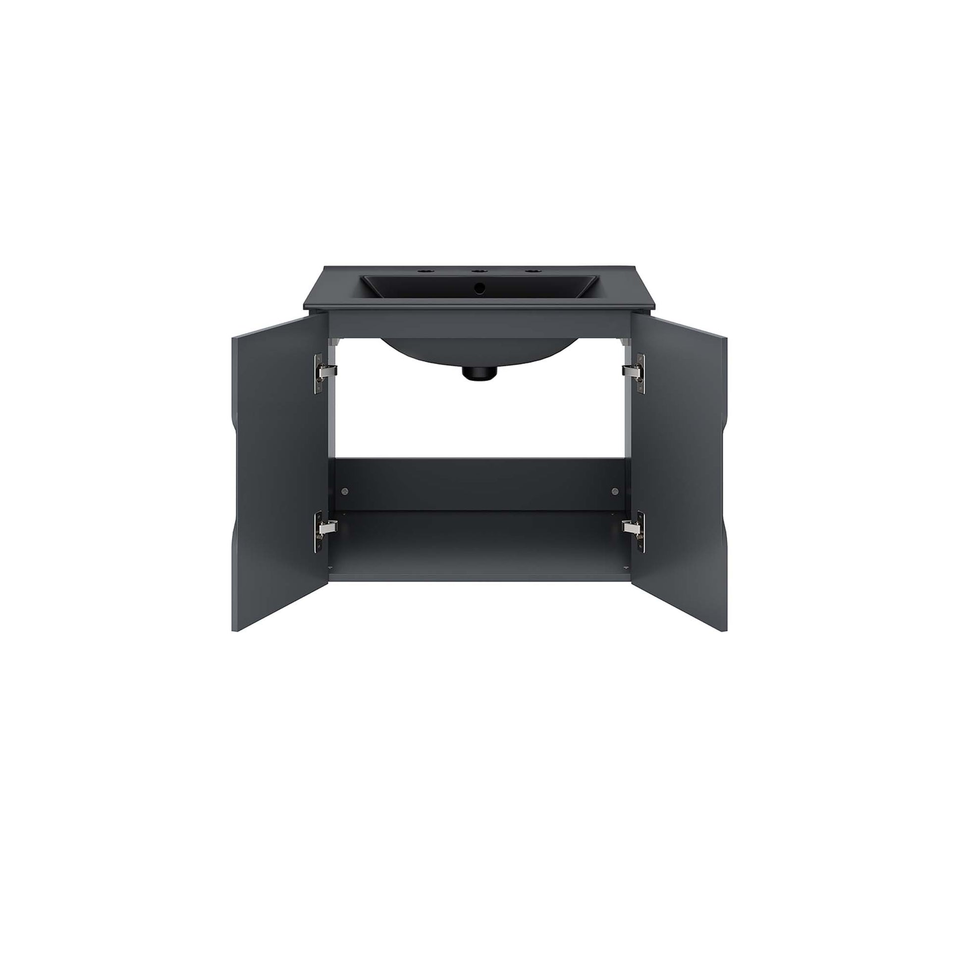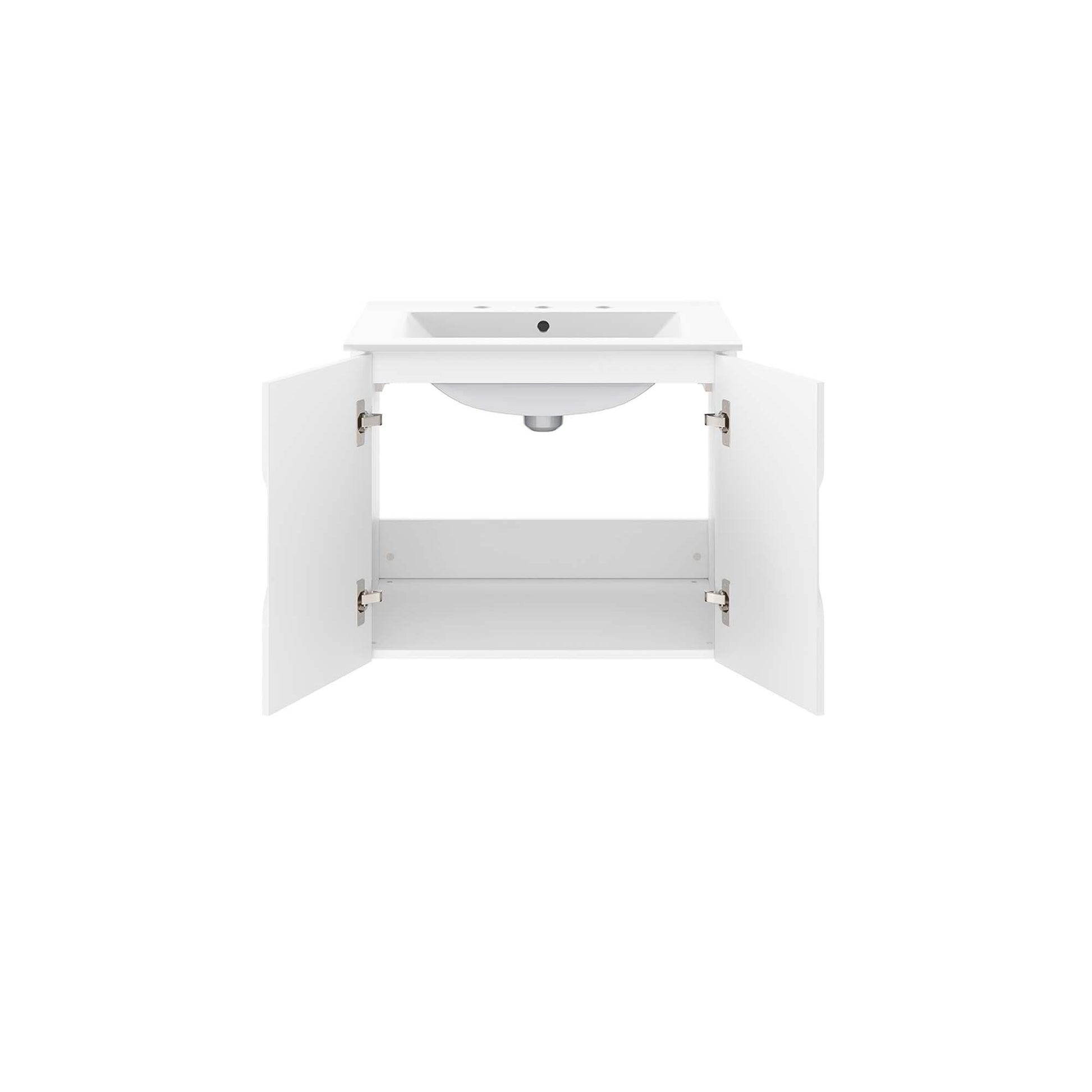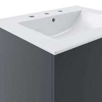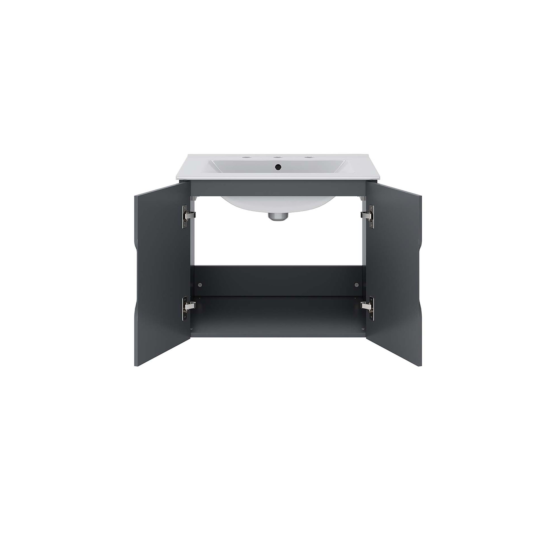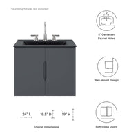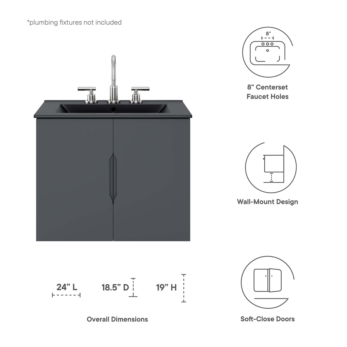 Energize your bathroom space with the modern design of the Vitality 24" Wall-Mount Bathroom Vanity. Boasting a sleek, clean-lined silhouette, this vanity is durably crafted with particleboard and MDF with a melamine finish. This vanity features a wall-mount design and is complete with ample storage space for all your bathroom essentials behind two soft-close doors. This vanity is complete with a ceramic sink basin with 8-inch centerset faucet holes and an integrated countertop. Organize bathroom essentials and keep counter space clean with ample storage space behind two soft-close doors. This vanity boasts an open back to accommodate plumbing. Fixtures not included. Assembly required.