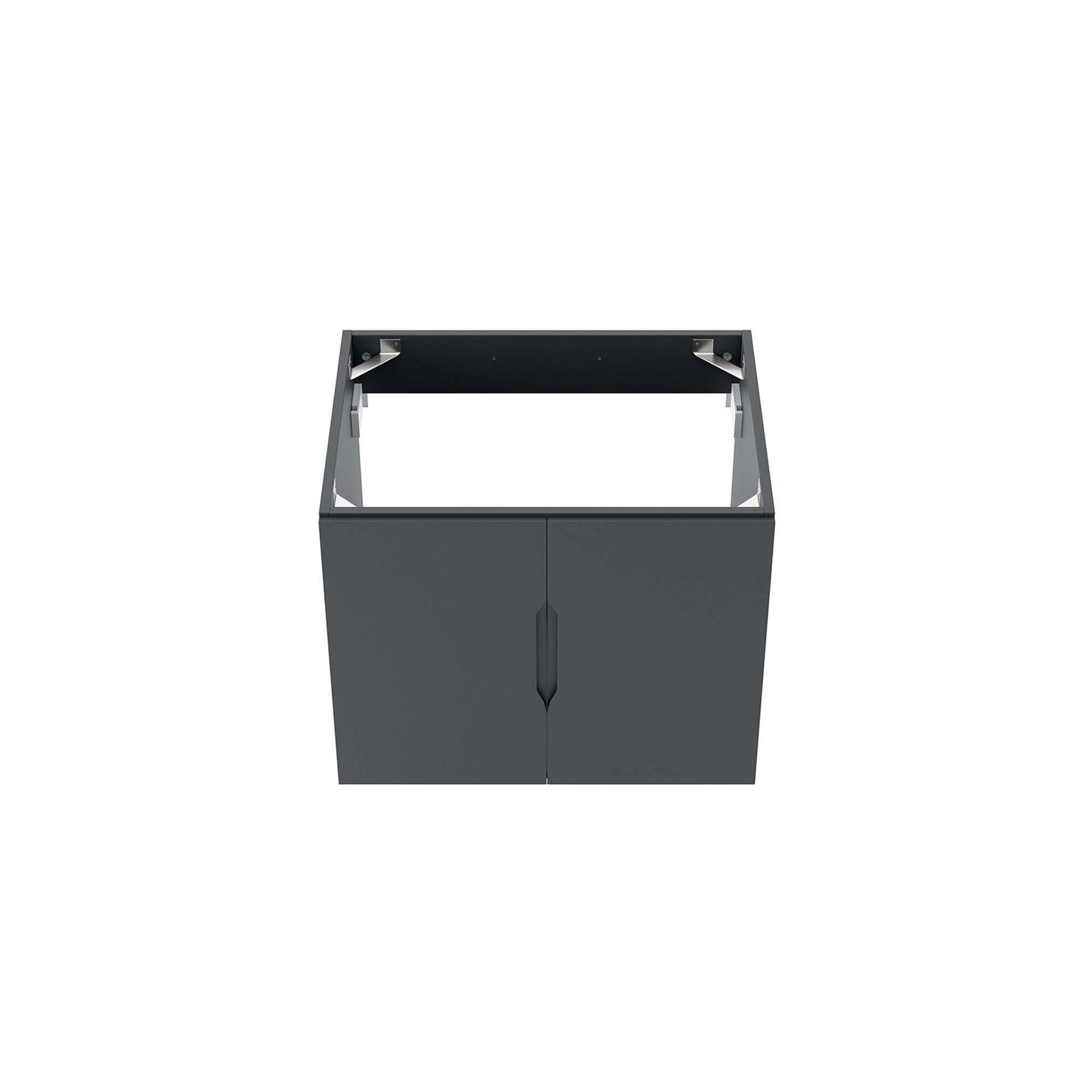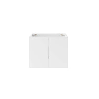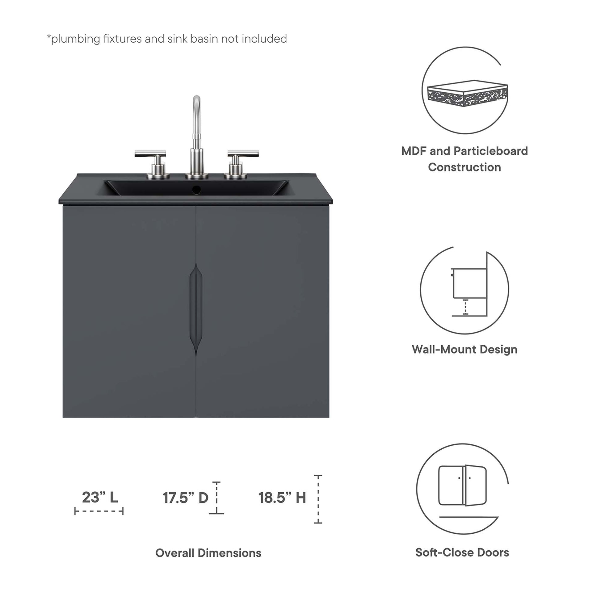 Energize your bathroom space with the modern design of the Vitality 24" Wall-Mount Bathroom Vanity. Boasting a sleek, clean-lined silhouette, this vanity is durably crafted with particleboard and MDF with a melamine finish. This vanity features a wall-mount design and is complete with ample storage space for all your bathroom essentials behind two soft-close doors. This vanity boasts an open back design to accommodate plumbing. Sink basin and fixtures not included. Assembly required.