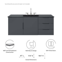 Energize your bathroom space with the modern design of the Vitality 48" Wall-Mount Bathroom Vanity. Boasting a sleek, clean-lined silhouette, this vanity is durably crafted with particleboard and MDF with a melamine finish. This vanity features a wall-mount design and is complete with ample storage space for all your bathroom essentials with two spacious drawers and an under-sink storage area behind two soft-close doors. This vanity boasts an open back design to accommodate plumbing. Sink basin and fixtures not included. Assembly required.