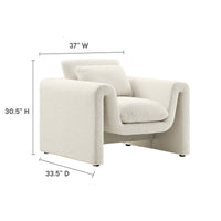 Divulge in the luxe splendor of the one-of-a-kind Waverly Boucle Fabric Armchair. This living room chair features a unique, wavy shape complete with bent lines and rounded edges. With dense foam padding for superior comfort, this accent chair is upholstered in boucle fabric with a charming nubby texture. The spacious seat and plush removable cushions create an inviting look and offer superior comfort while resting and relaxing. The adjustable non-marking foot pads elevate the upholstered armchair to perfectly fit your space while protecting your floors. With its beautiful silhouette and cozy comfort, this boucle chair is a stylish piece for the living room, bedroom, office, or reception area. No assembly required. Weight Capacity: 330 lbs.