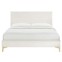 Introduce a polished aesthetic in your master bedroom or a guest room with the sleek and elegant Yasmine Channel Tufted Performance Velvet Queen Platform Bed. The queen-sized upholstered bed brings contemporary refinement with subtle glam deco style into mid-century modern or eclectic settings, featuring vertical channel tufting set within soft angular lines. Tailored in stain-resistant performance velvet, the durable MDF bed frame provides a sturdy foundation for memory foam, innerspring, latex, and hybrid mattresses. The well-crafted poplar wood slat support system features a reinforced center beam and two support legs, granting endless support and eliminating the need for a box spring. The slatted queen bed frame rests on wood legs with gold metal sleeves and non-marking foot caps. Assembly required. Weight Capacity: 800 lbs.