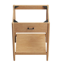Infuse your bathroom decor with the subtle charm and simplicity of the Zaire 24” Bathroom Vanity Cabinet. This exquisite washstand combines sleek, contemporary lines with the natural beauty of wood in an organic minimalist design. Crafted from MDF and solid rubberwood and topped with a wood grain veneer, this vanity’s design is emphasized by a metal handle pull on its fixed drawer, giving it a touch of urban chic. Below this, you'll find an open shelf, ideal for holding towels or showcasing your favorite decorative pieces. This vanity’s tapered wood legs are a modest and understated design choice that completes the overall simple mid-century aesthetic. Includes adjustable, non-marking feet for added stability and floor protection. Assembly required. Fixtures and sink basin not included. Weight Capacity: 275 lbs.