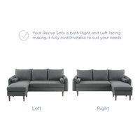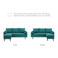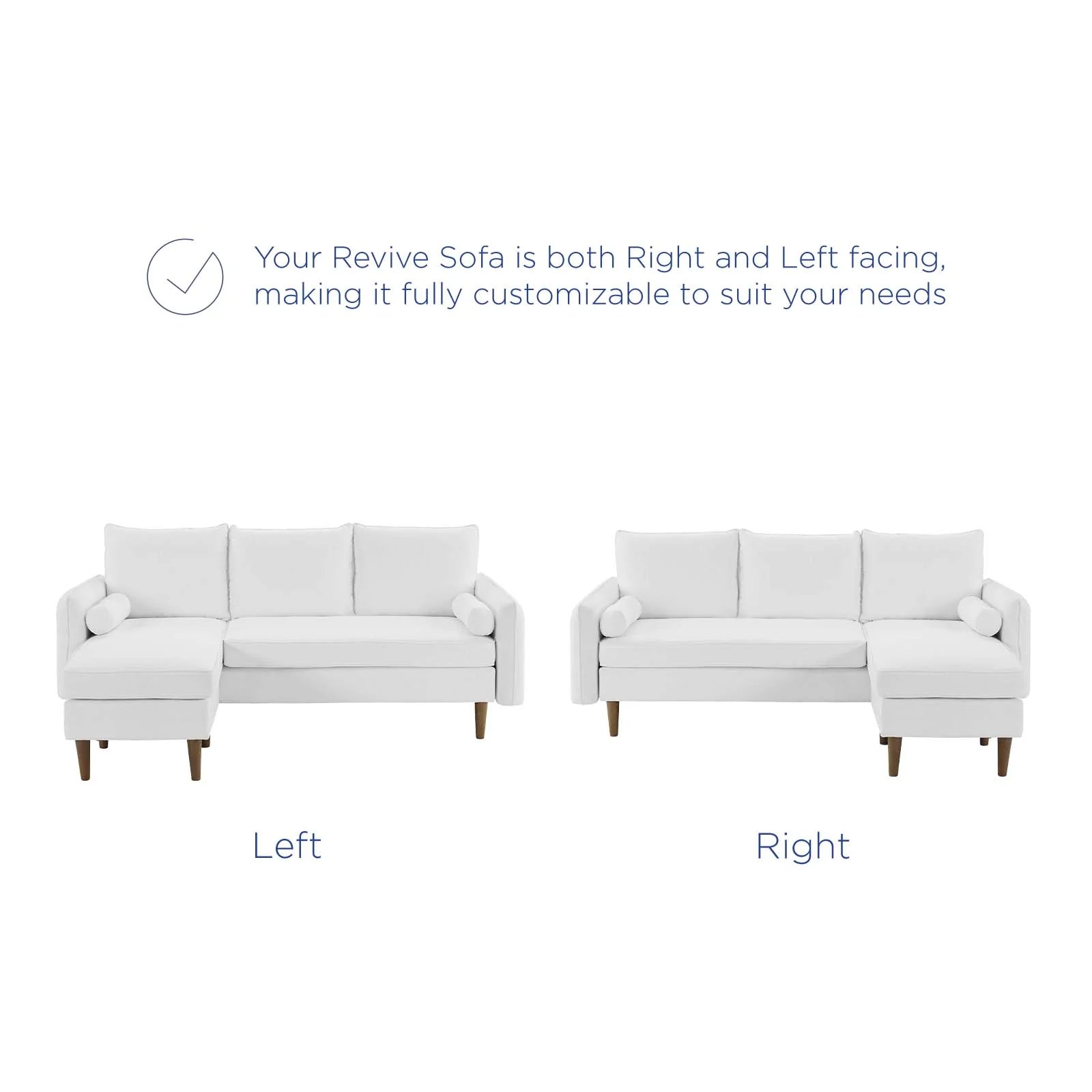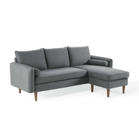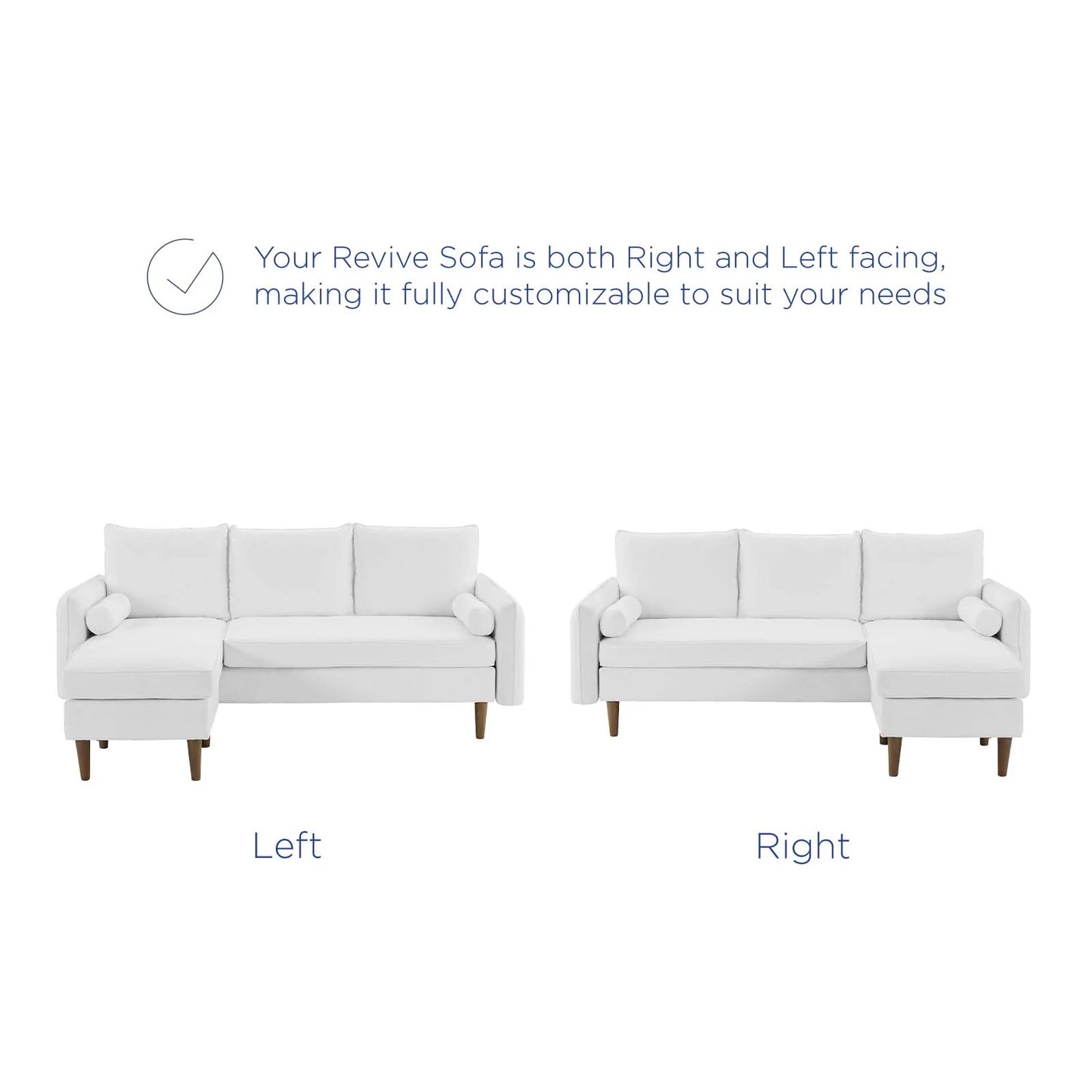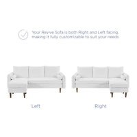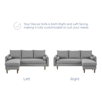 • Give new vitality to your living space with the Revive Upholstered Fabric Right or Left Sectional Sofa Sectional Sofa. With a comfortable yet tailored profile and two bolster pillows, Revive Living Room Couch beckons guests to sit and stay a while. Dense foam padding and a pocket coil spring system provide a luxurious seating experience. Soft polyester fabric upholstery grants this three-seater sectional sofa with a right or left facing chaise an approachable appeal that’s echoed by its calming color, clean lines, and splayed and tapered wood legs with non-marking foot caps. The Revive Right-Facing Sofa has a built in ottoman that allows for a variety of comfortable lounging combinations and accommodates a multiple decor styles in your living room, lounge room, or other seating area. Weight Capacity: 900 lbs.