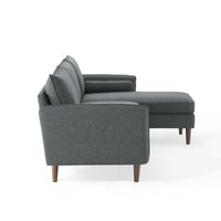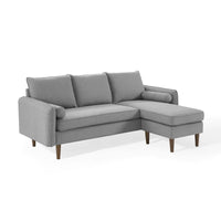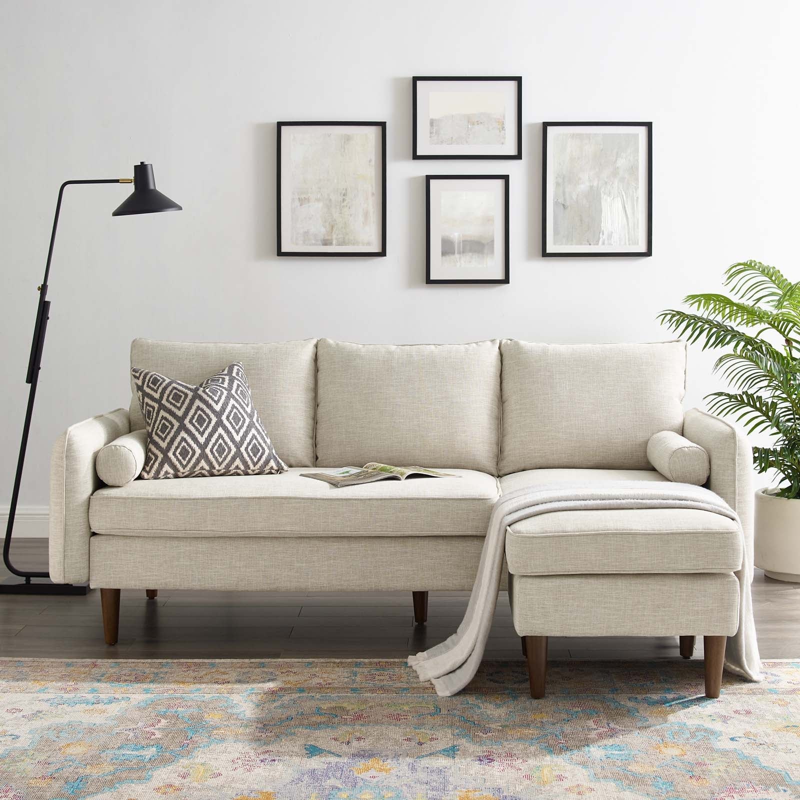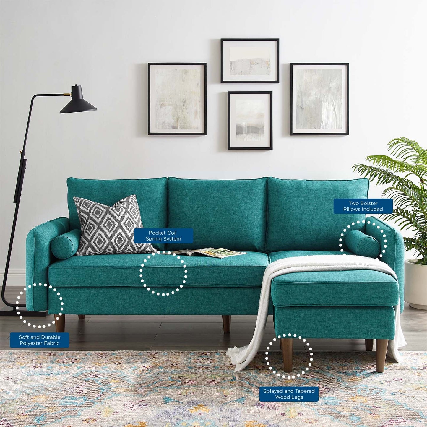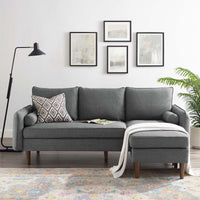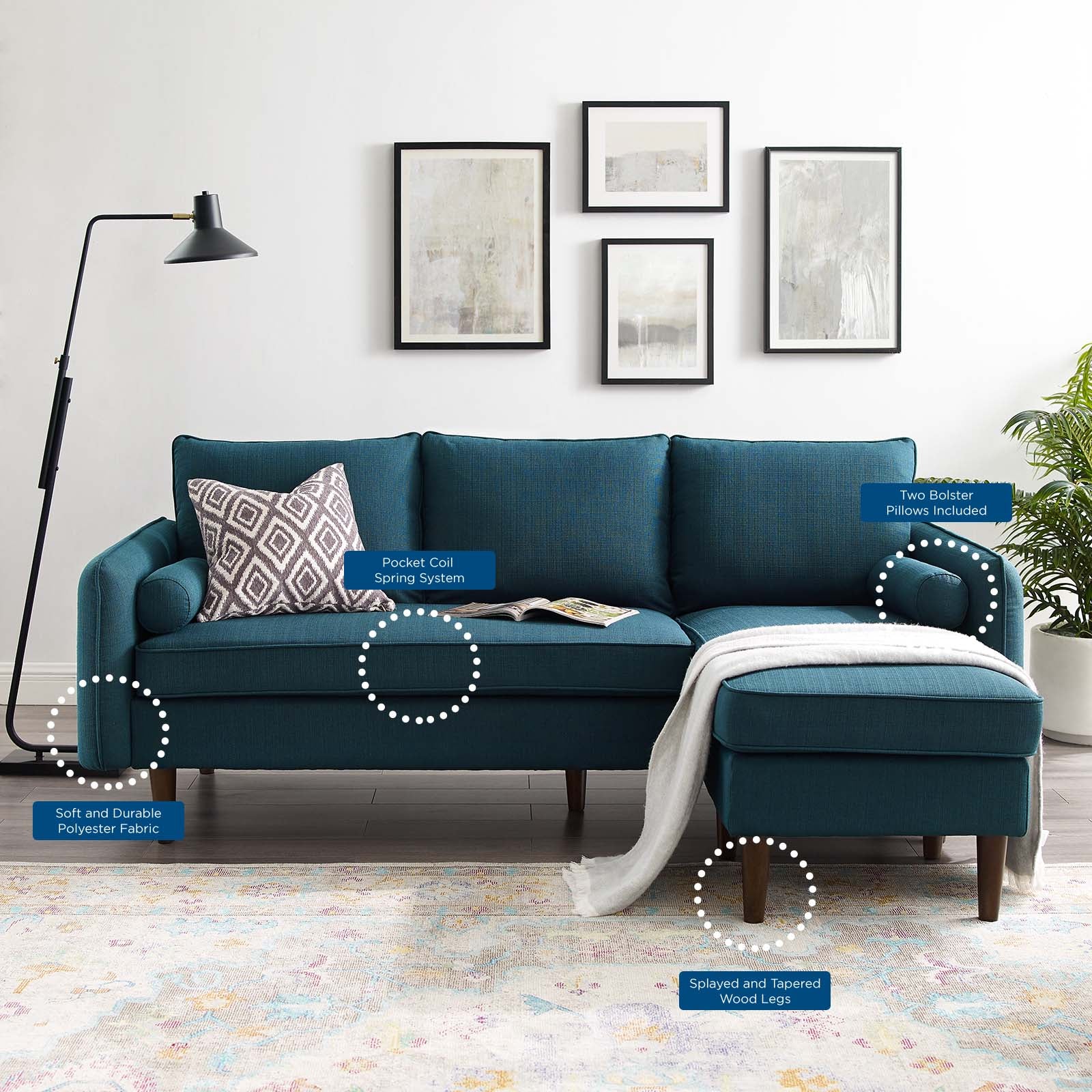 • Give new vitality to your living space with the Revive Upholstered Fabric Right or Left Sectional Sofa Sectional Sofa. With a comfortable yet tailored profile and two bolster pillows, Revive Living Room Couch beckons guests to sit and stay a while. Dense foam padding and a pocket coil spring system provide a luxurious seating experience. Soft polyester fabric upholstery grants this three-seater sectional sofa with a right or left facing chaise an approachable appeal that’s echoed by its calming color, clean lines, and splayed and tapered wood legs with non-marking foot caps. The Revive Right-Facing Sofa has a built in ottoman that allows for a variety of comfortable lounging combinations and accommodates a multiple decor styles in your living room, lounge room, or other seating area. Weight Capacity: 900 lbs.
