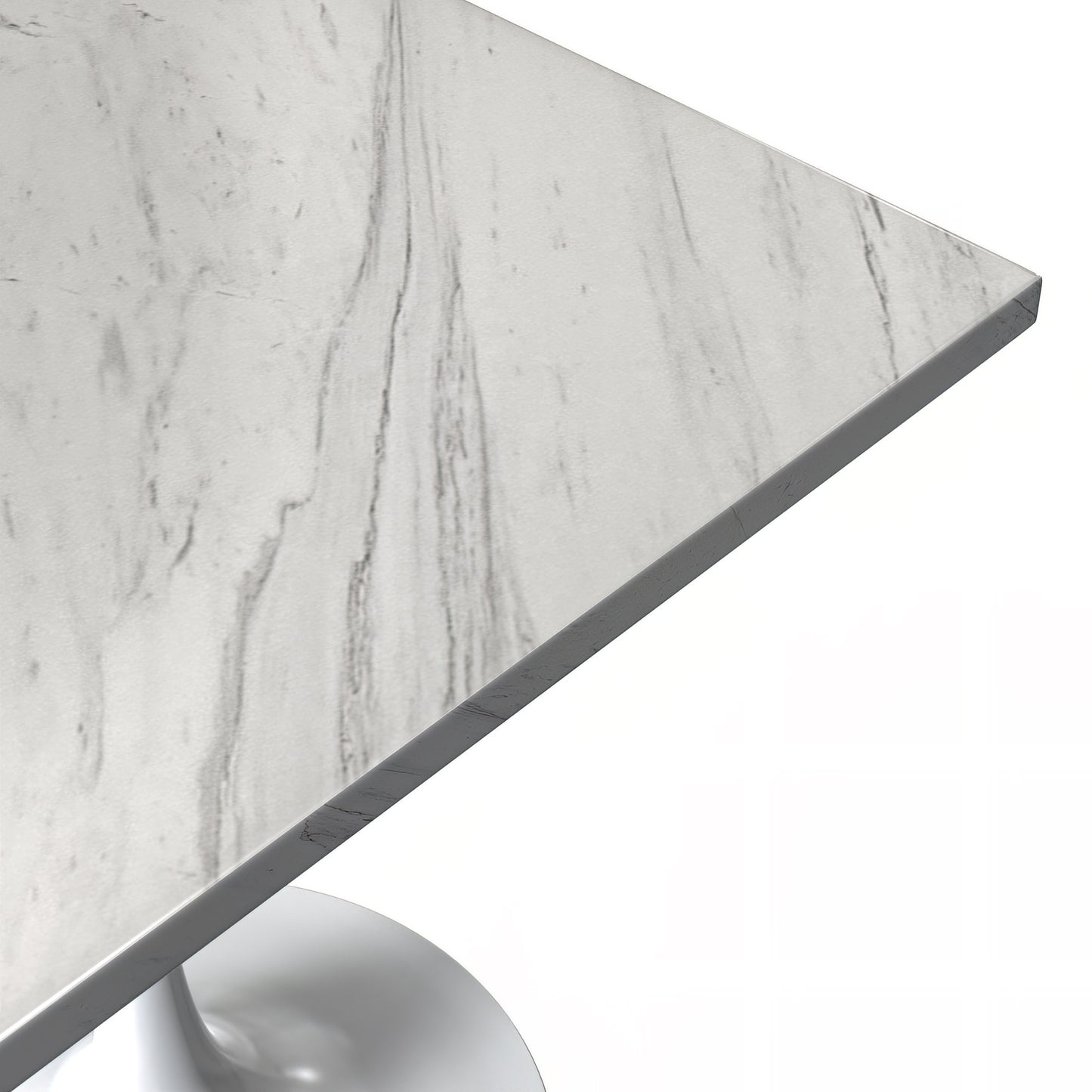 • The stainless steel base is adorned with a powder-coated finish in a pristine white color. The powder coating enhances the base's resistance to scratches and corrosion, ensuring that your table retains its polished look for years to come